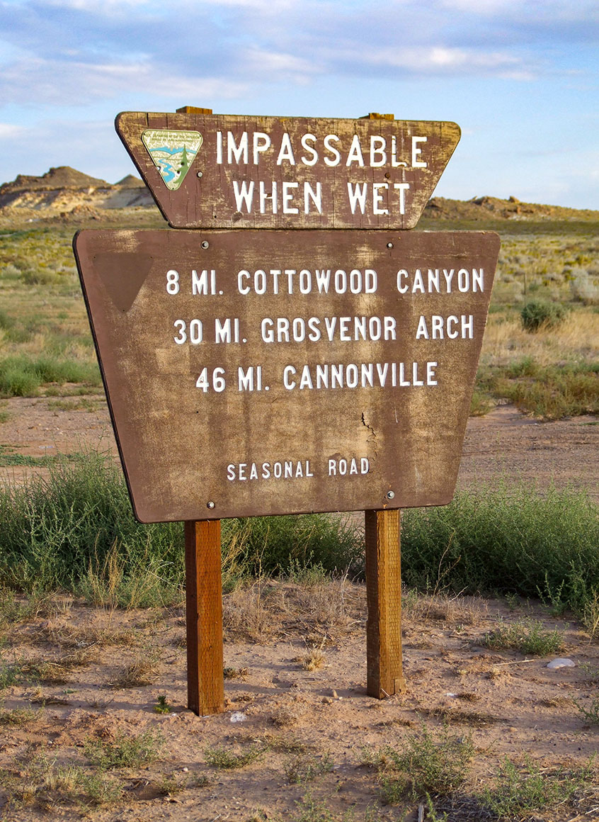 Etwa vier Meilen hinter Churchwells erreichen wir die Abzweigung zur Cottonwood Road, einer Strecke, die unter Abenteurern fast schon legendär ist. Zwischen den Milemarkern 17 und 18 biegen wir ab und tauchen ein in eine neue Welt. Die Straße ist keine asphaltierte Autobahn mehr, sondern eine staubige Dirt Road, und schon das große Schild mit der Aufschrift „Impassable When Wet“ gibt uns einen ersten Vorgeschmack darauf, was uns hier erwartet.