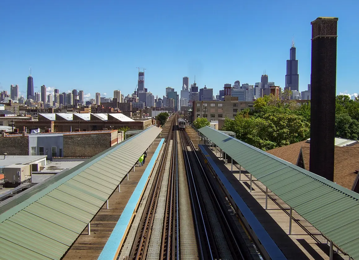Die Streckenführung ist ein Erlebnis für sich. Die L schwebt auf Gitterträgern über den belebten Straßen, vorbei an beeindruckenden Backsteinfassaden, glänzenden Wolkenkratzern und charmanten Wohnhäusern, die den Charakter Chicagos prägen. Besonders der Abschnitt, der durch die berühmte Loop-Schleife führt, ist ein Fest für die Augen: Hier umkreist die Bahn das Geschäftsviertel, und von den Waggons aus sieht man dicht aneinander gereihte Gebäude, in deren Fenstern sich die Sonne spiegelt.