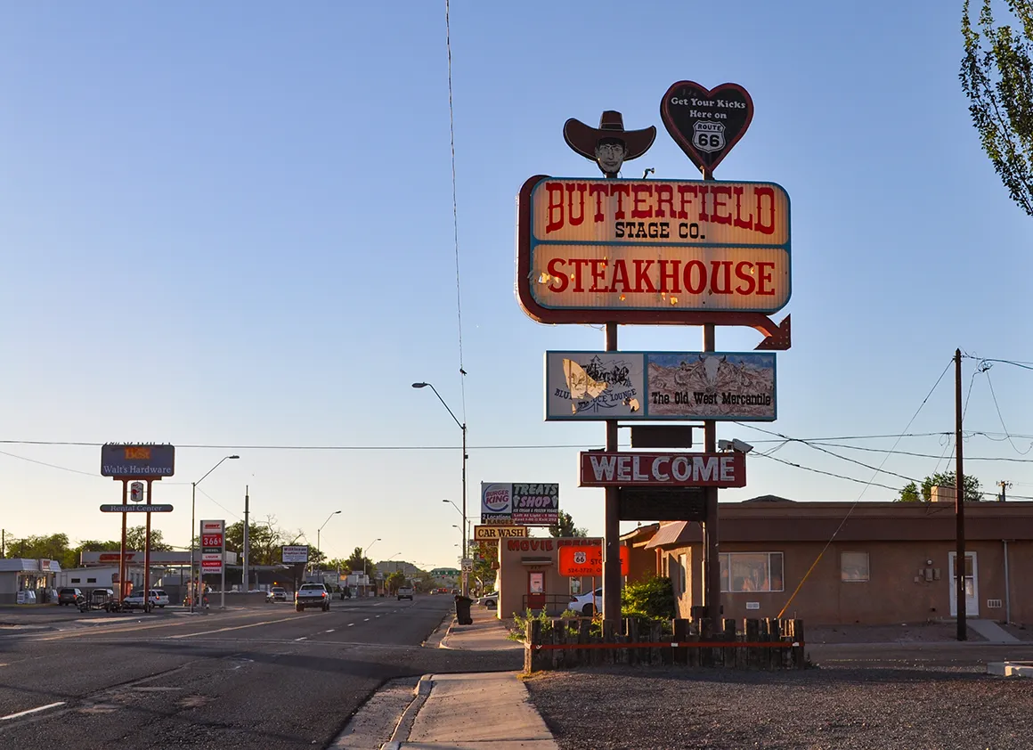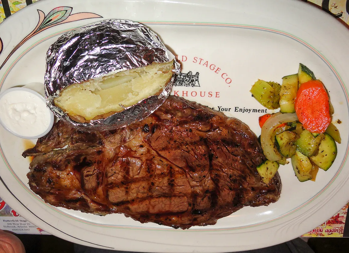 Direkt neben unserem Wigwam stolpern wir – im wahrsten Sinne des Wortes – über das Butterfield Steakhouse. Näher kann ein Abendessen kaum liegen, es sei denn, jemand hätte uns das Steak direkt durchs Fenster gereicht. Nach diesem Tag sind wir nicht wählerisch, sondern schlicht hungrig. Diese ehrliche, tiefe Roadtrip-Art von Hunger, bei der Salat nur als Garnitur existiert.