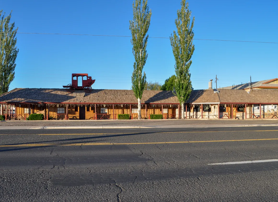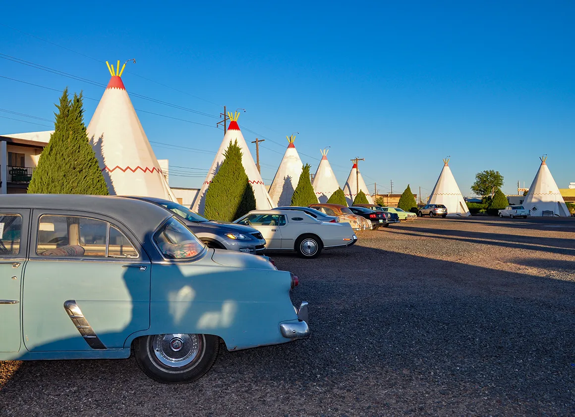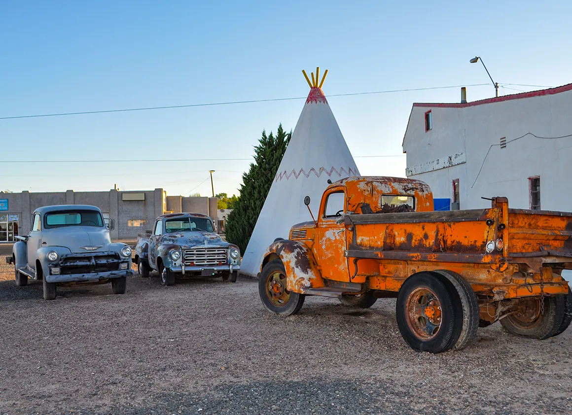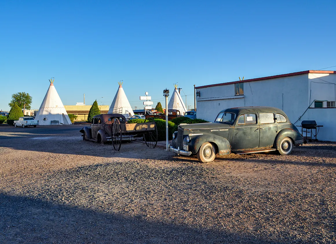 Die kleinen, steinernen Tipis stehen ordentlich in Reih und Glied, als hätten sie sich extra für uns geschniegelt. Davor: alte Straßenkreuzer, sorgfältig platziert, chromblitzend im Abendlicht. Kein Zufall, kein Deko-Konzept – das ist hier Teil der DNA. Man steigt aus dem Auto und ist schlagartig mehrere Jahrzehnte früher dran. Die Route 66 meint es ernst.