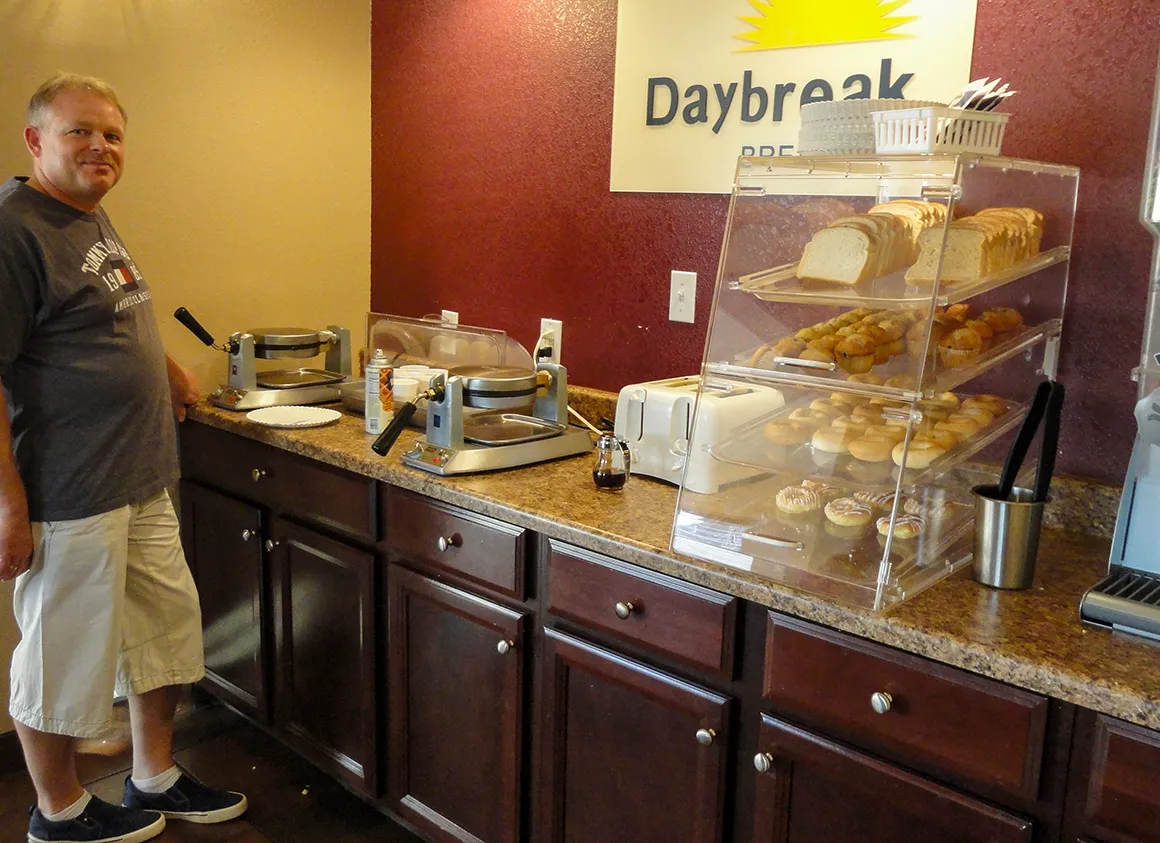 Erster Pflichttermin: Frühstück. Days Inn Metro Center. Continental Breakfast. Das klingt immer ein bisschen nach Minimalismus, entpuppt sich aber wie so oft als überraschend effizient. Toast, Kaffee, irgendwas mit Zucker – und dann dieser Waffelautomat. Dieses Gerät ist kein Küchengerät, das ist ein Versprechen. Man kippt Teig hinein, schließt den Deckel, wartet kurz, und plötzlich riecht der Raum nach „Urlaub beginnt jetzt wirklich“. Ich bin sofort dabei. Mit einer frisch gebackenen Waffel in der Hand fühlt sich selbst Jetlag halb so schlimm an.