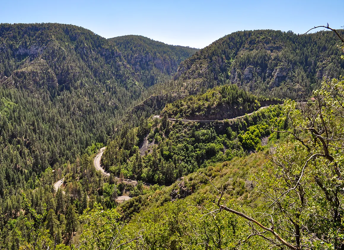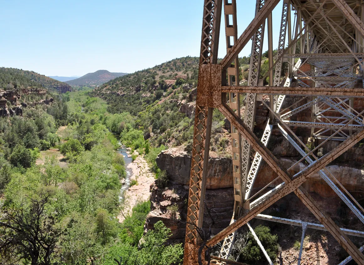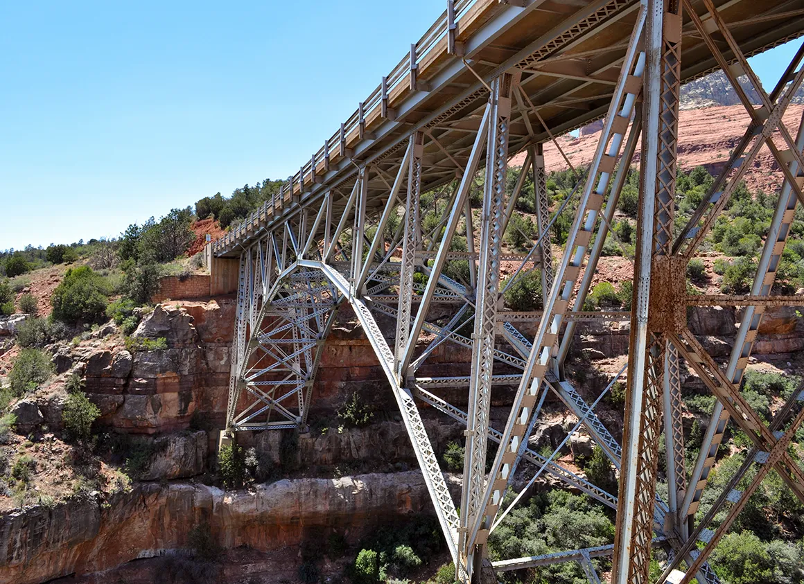 Weiter geht’s, die Straße windet sich, und irgendwann taucht die Midgley Bridge auf. Kurzer Stopp. Kein großes Planen, kein langes Überlegen. Anhalten, aussteigen, schauen. Die Brücke spannt sich über den Oak Creek Canyon, technisch, nüchtern – und gleichzeitig perfekt platziert. Darunter Grün, Felsen, Tiefe. Einer dieser Orte, bei denen man merkt, wie gut die Amerikaner darin sind, Funktion und Aussicht zu kombinieren. Wir bleiben nicht lange. Müssen wir auch nicht. Es reicht, es gesehen zu haben.