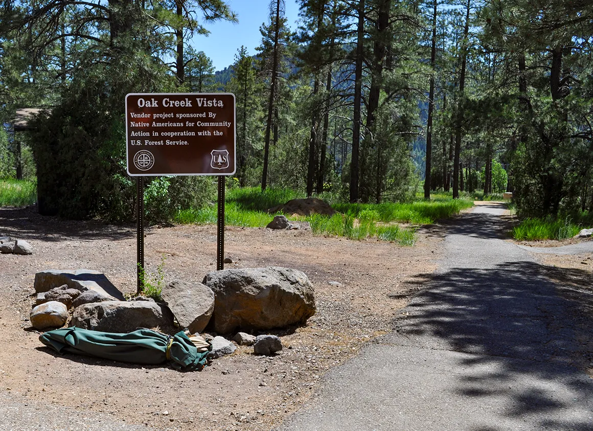 Ein paar Kurven später: Oak Creek Vista. Aussichtspunkt. Klingt harmlos. Ist es nicht. Wir steigen aus – und werden fast wieder zurück ins Auto geblasen. Wind. Nicht so ein freundlicher „Oh, es zieht ein bisschen“, sondern dieser ernsthafte Wind, der sagt: Bleib nicht zu lange, ich hab heute keine Geduld. Aber die Aussicht ist es wert. Tief eingeschnittene Schluchten, grün unten, felsig oben, alles wirkt gleichzeitig ruhig und wild.