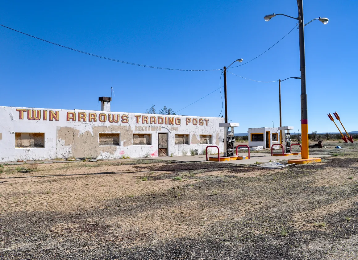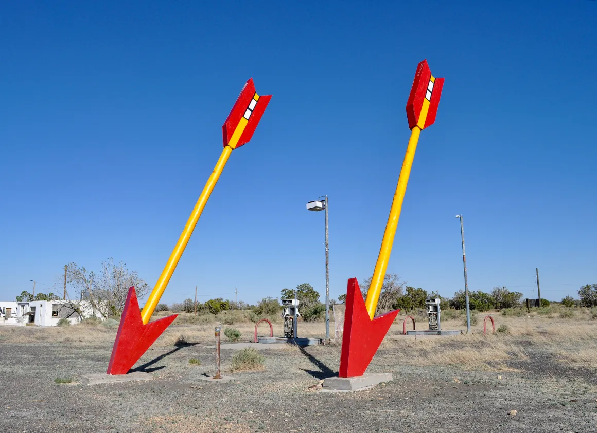 Man kann sie nicht übersehen. Zwei riesige Pfeile, schräg in den Himmel gerammt, als hätte jemand versucht, der Landschaft eine Richtung vorzugeben. Wir halten an. Natürlich halten wir an. Früher war das hier ein Truck Stop, ein Diner, Souvenirhölle und Treffpunkt für alle, die unterwegs waren und kurz vergessen wollten, wohin sie eigentlich wollten. Heute ist es still. Sehr still. Aber genau das macht es besonders.