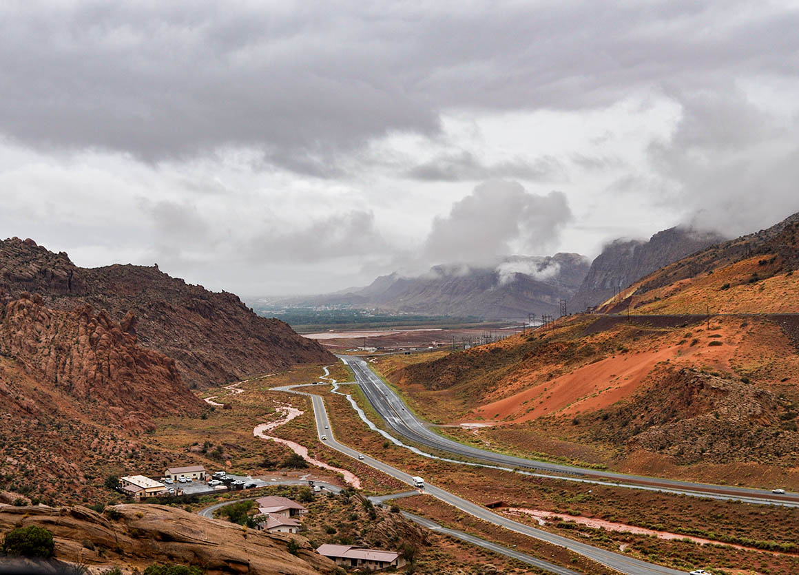 Die Straße schmiegt sich eng an den Colorado River, windet sich durch eine schmale Schlucht, links Felswand, rechts Wasser – oder umgekehrt, je nach Laune der Landschaft. Die roten Sandsteinwände rücken so nah an die Straße heran, dass man fast das Gefühl hat, sie würden sich über uns beugen, um zu schauen, wer da durchfährt. Der Fluss zieht ruhig nebenher, trüb vom Regen der letzten Tage, und bildet einen starken Kontrast zu den dunklen Wolken, die schwer über den Canyons hängen.