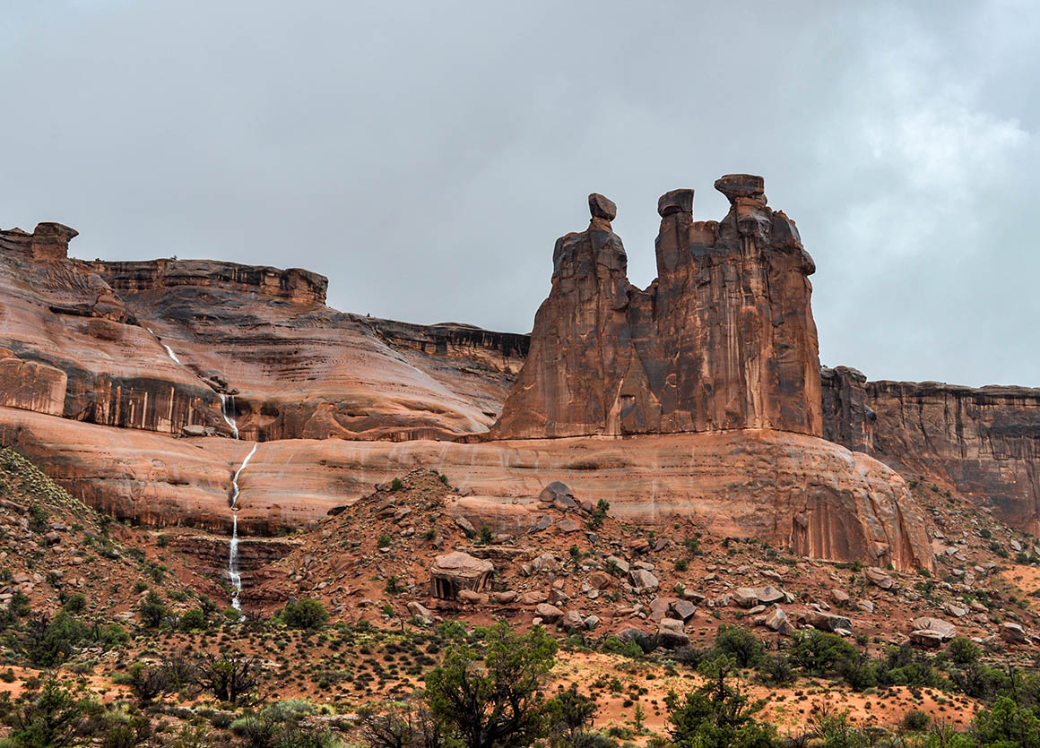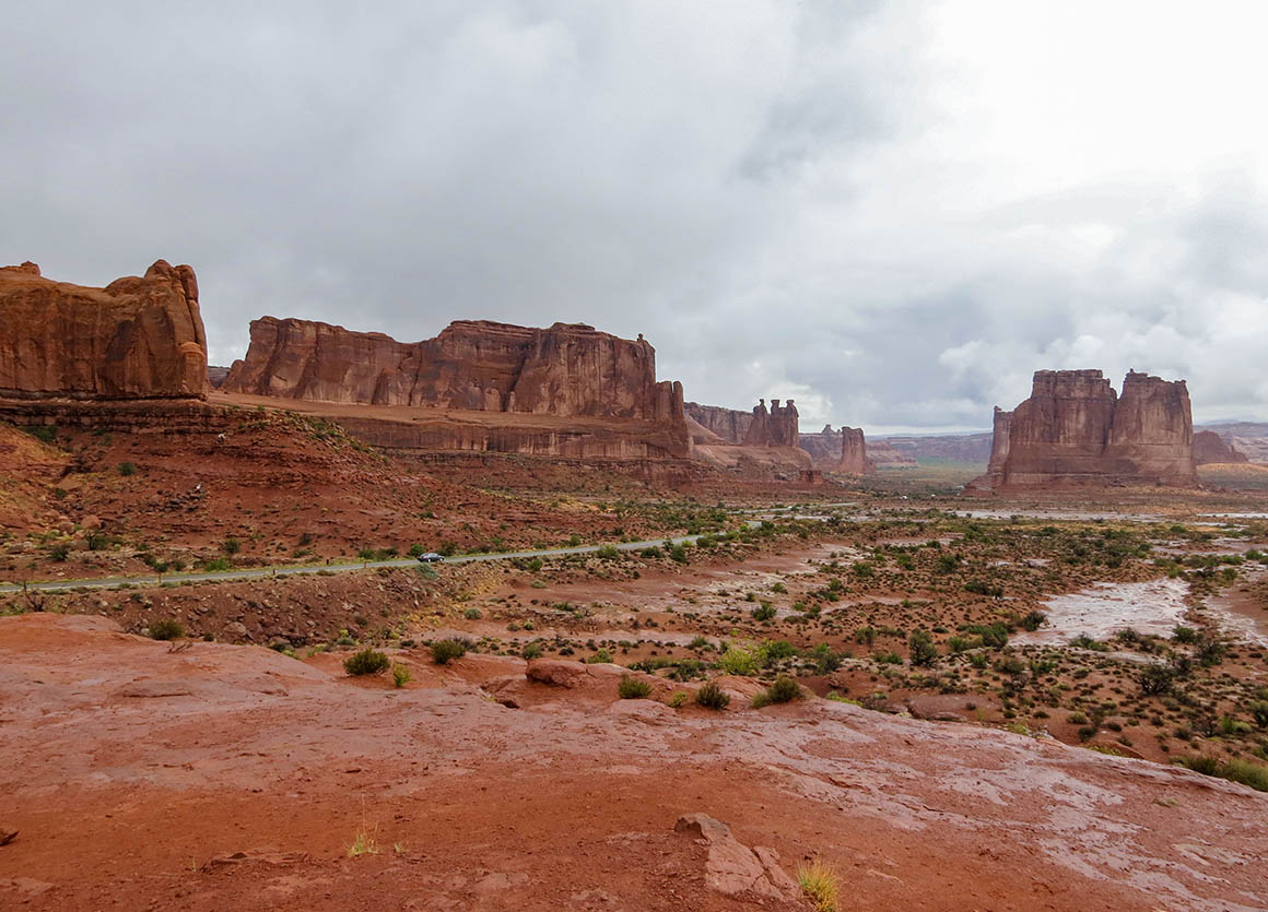 Über uns hingen dicke, graue Regenwolken, die so aussahen, als hätten sie sich fest vorgenommen, den Park heute nicht mehr zu verlassen. Fotografisch ist das ungefähr die Kategorie „dramatisch, aber halt nicht das, was man sich erträumt“. Trotzdem: Umdrehen kam nicht infrage. Also rein in den Park, rauf auf den Arches Scenic Drive.