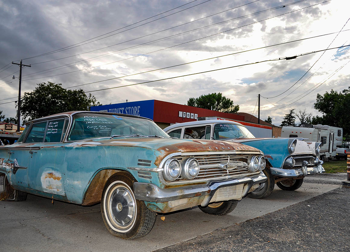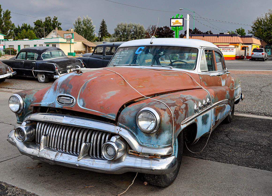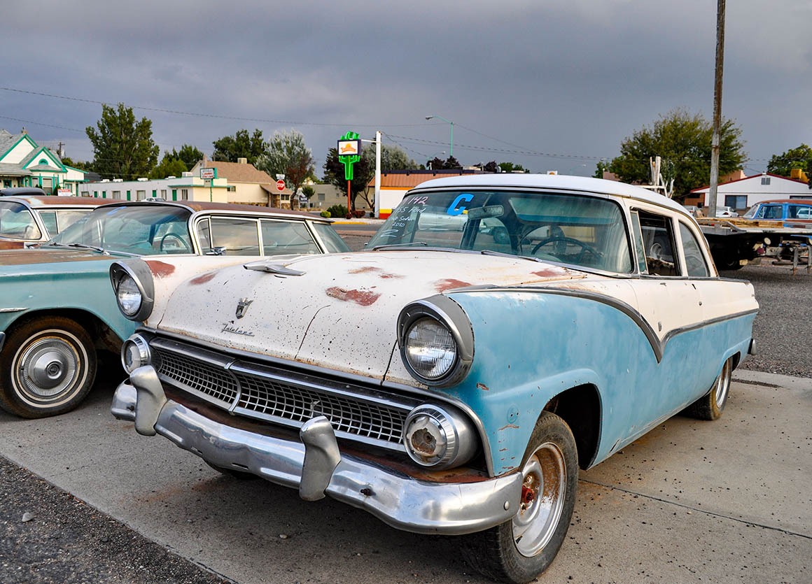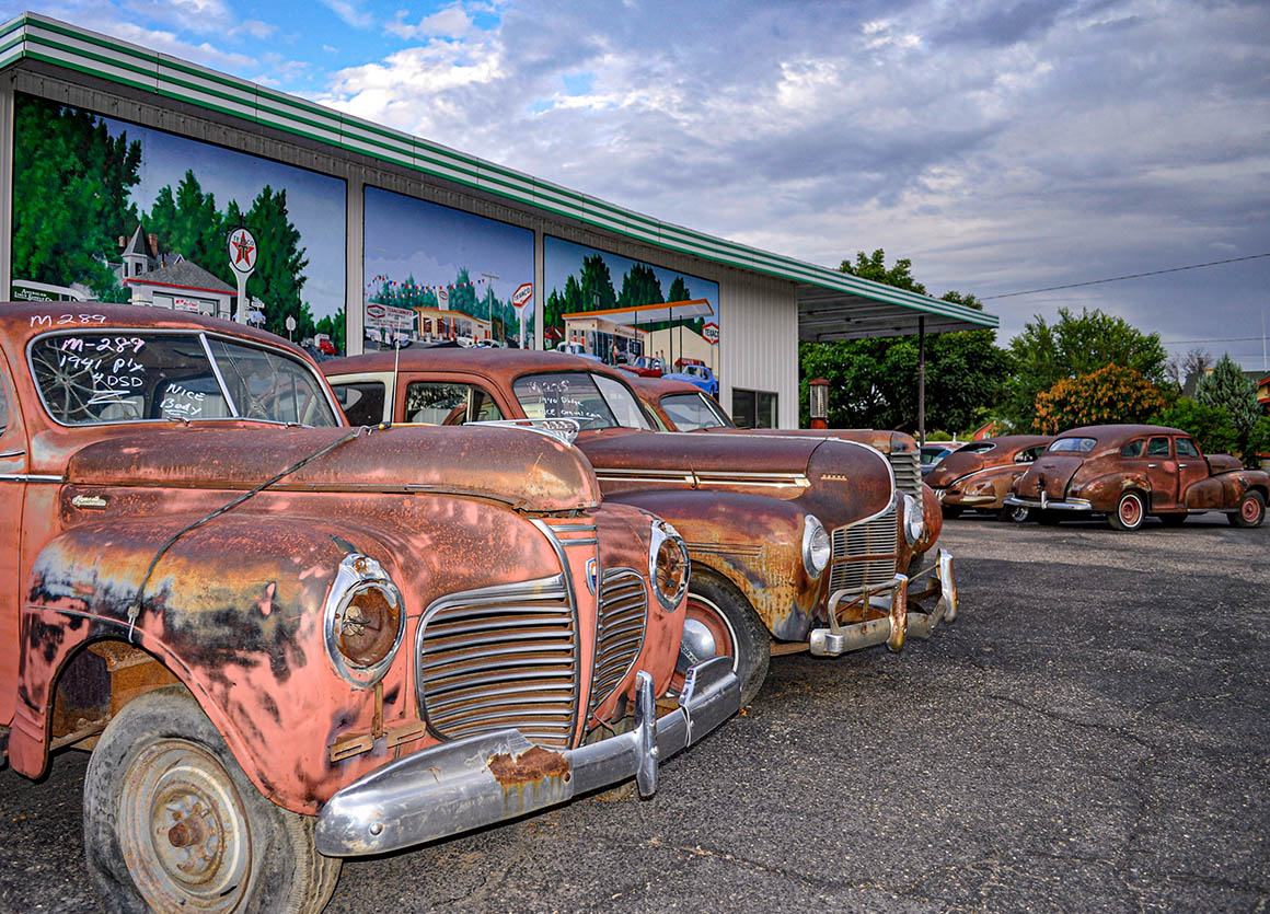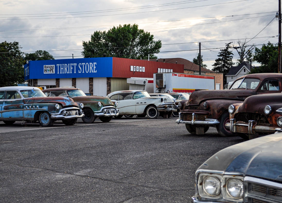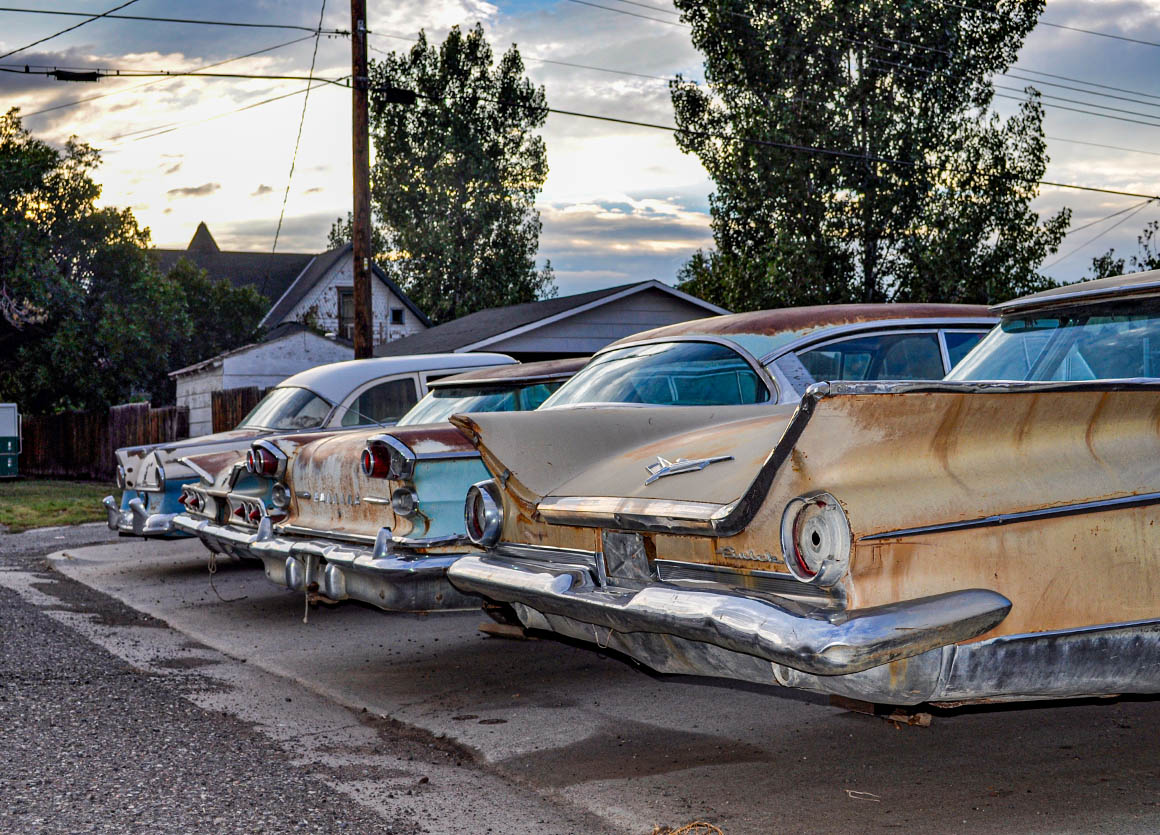 Doch als wäre das noch nicht genug gewesen, wartete gleich außerhalb der Stadt das nächste Highlight – völlig ungeplant, versteht sich. Ein Gebrauchtwagenhändler hatte offenbar beschlossen, seinen Hof in ein rollendes Museum der 50er Jahre zu verwandeln. Chrom, Rost, Patina, Heckflossen, die locker als Startbahn für kleine Flugzeuge durchgehen könnten. Reihenweise Oldtimer, geschniegelt, angerostet oder irgendwo dazwischen – aber alle mit Charakter. Viel Charakter.