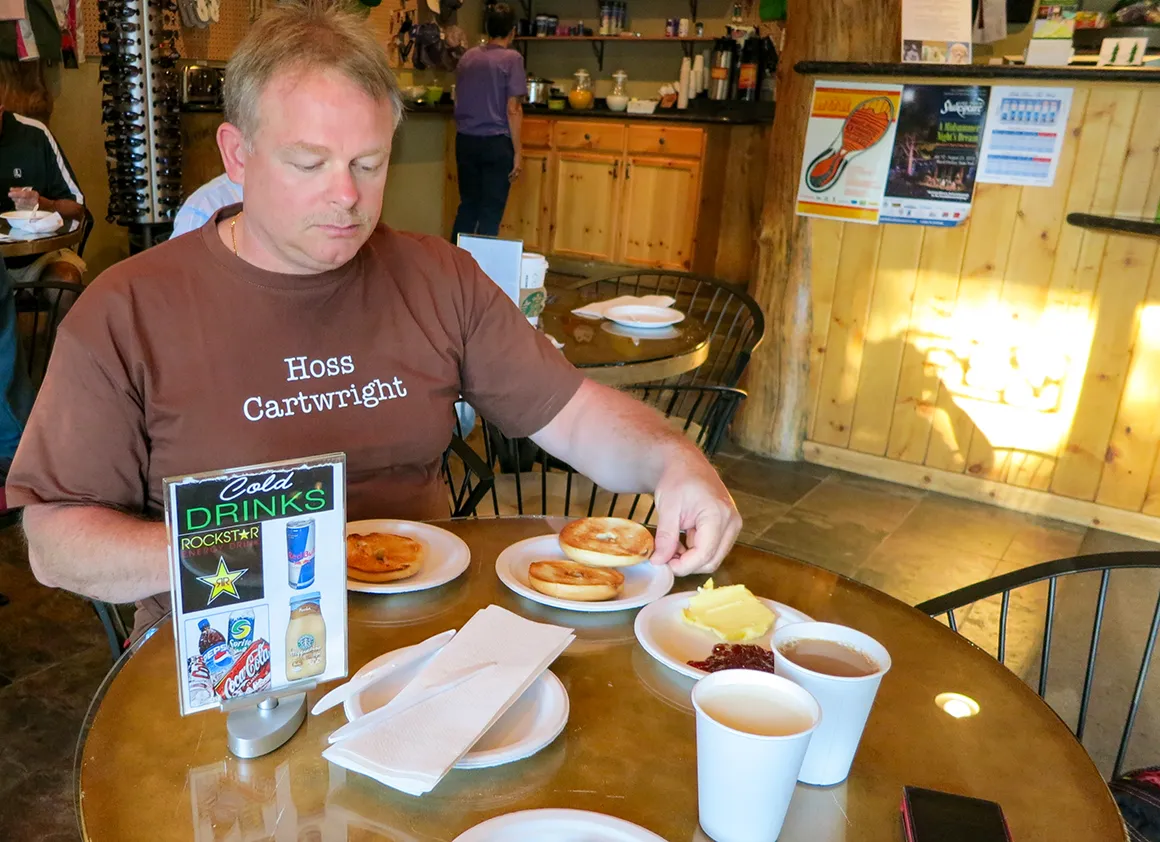 Der Tag beginnt genau so, wie man ihn sich in den Bergen wünscht: Sonne, klare Luft und Frühstück inklusive. Im Big Pines Mountain House greifen wir beherzt zu – Kaffee, Donuts, alles was nötig ist, um einem großen Tag würdig zu begegnen. Stefan testet die amerikanische Donut-Statik, ich prüfe, ob man durch ein Loch wirklich die Welt besser sehen kann. Wissenschaftlich natürlich.