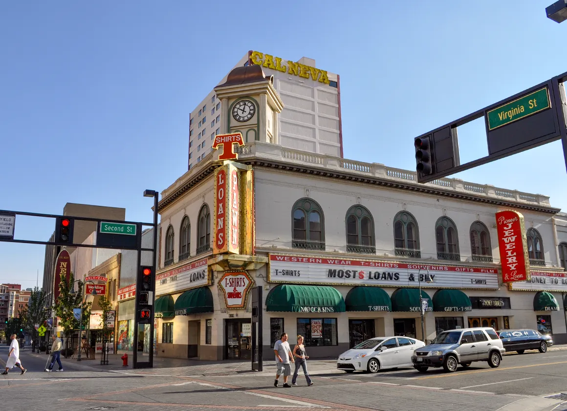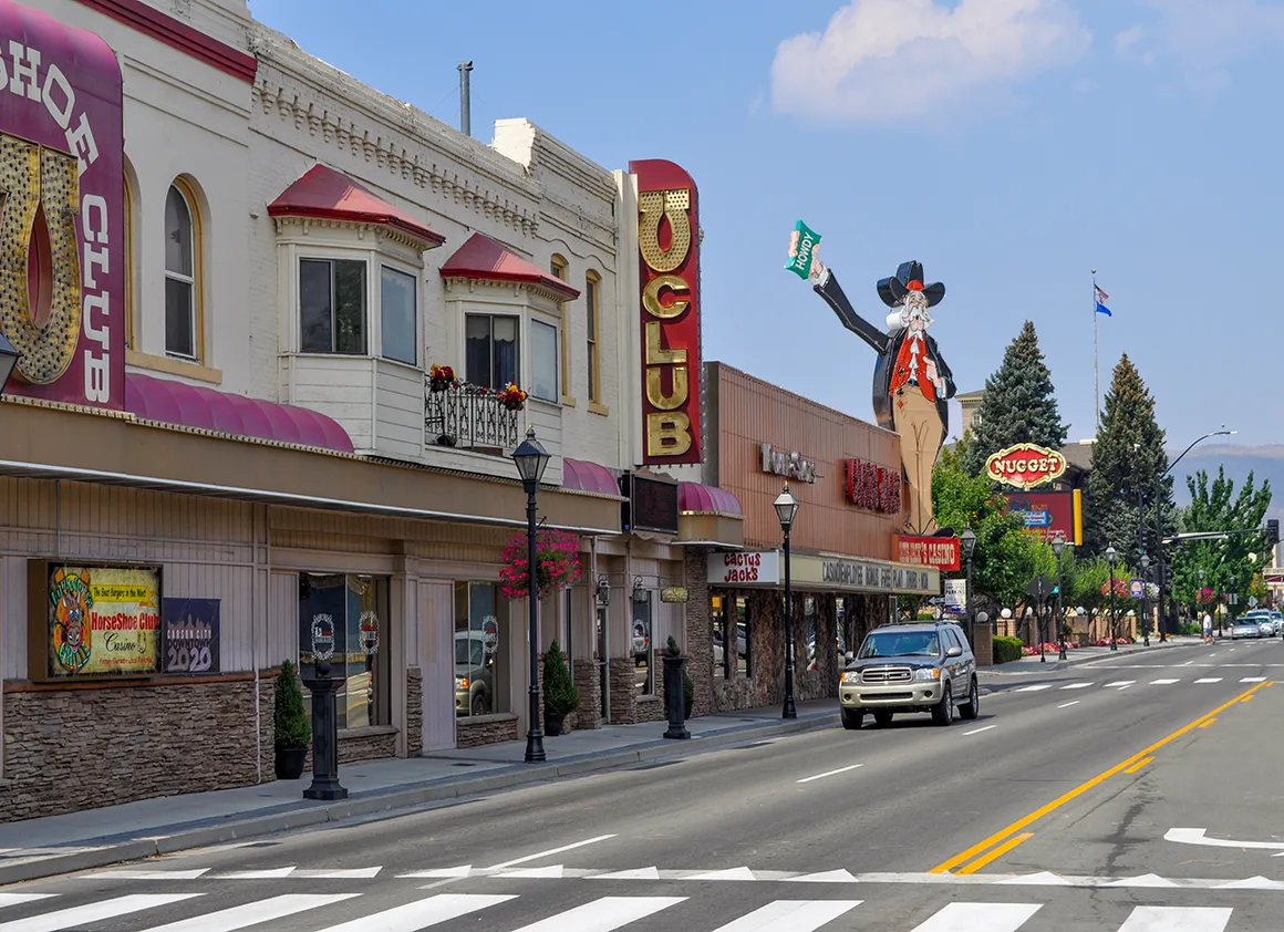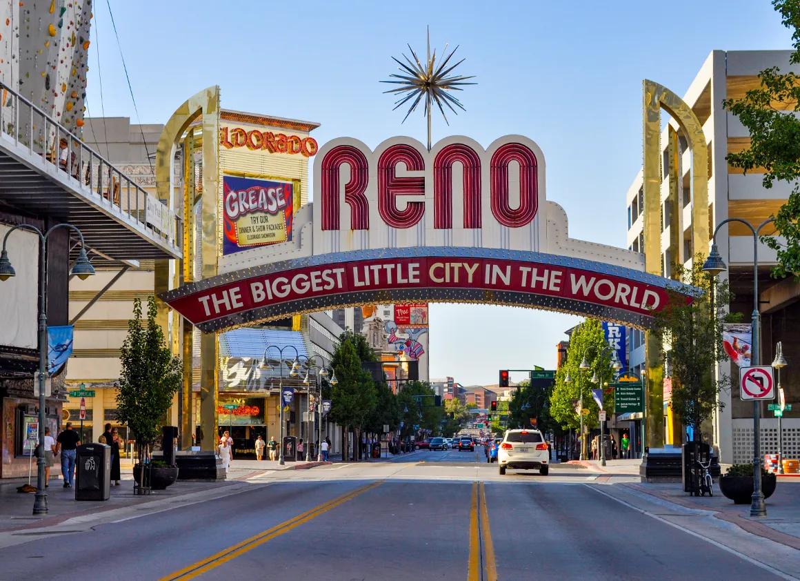 Und dann, ziemlich plötzlich, taucht sie auf: Reno. Oft als Klein-Las-Vegas bezeichnet – was gleichzeitig schmeichelt und warnt. Die Skyline mit ihren glitzernden Casinos, Neonlichtern und dem leichten Hang zur Übertreibung ist… hübsch. Nicht überwältigend, aber unterhaltsam. Wir legen einen kurzen Stopp im Casino-Viertel ein, schießen ein paar Fotos und lassen uns für einen Moment von dieser speziellen Mischung aus Glücksspiel, Show und Alltagsbetrieb treiben.