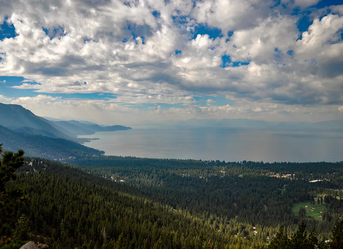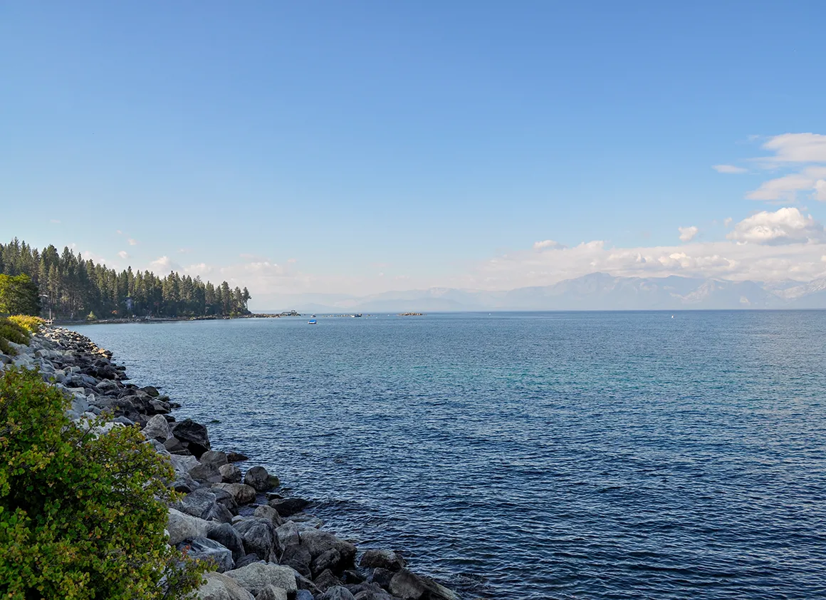 Der Lake Tahoe macht schon früh klar, warum er den Beinamen „Lake in the Sky“ trägt. 35 Kilometer lang, 19 Kilometer breit, an der tiefsten Stelle satte 501 Meter tief – und das alles eingebettet in eine Bergkulisse mit Gipfeln jenseits der 3.000 Meter. Ein See mit ernstzunehmender Präsenz. Still, klar, fast unwirklich blau. Man schaut hin und denkt automatisch: Das ist kein See, das ist ein Statement.