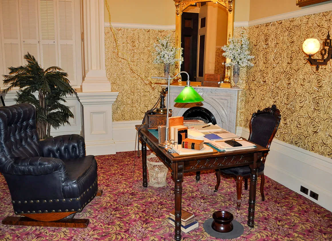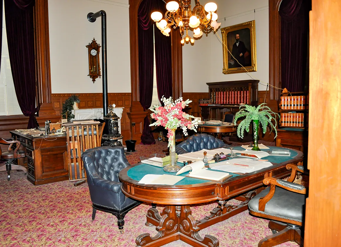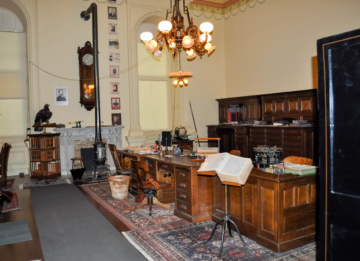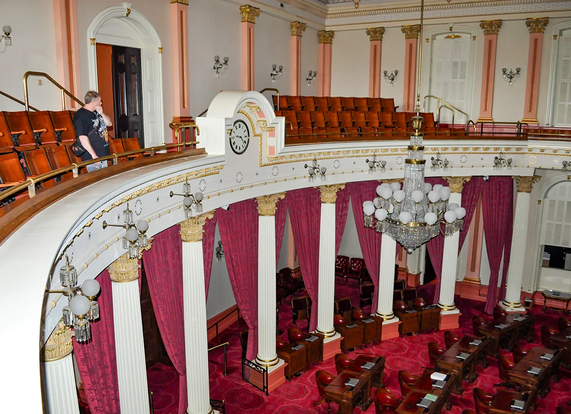 Besonders faszinierend sind die Sitzungssäle. Wir blicken von den oberen Rängen in den Plenarsaal, sehen die Reihen der Schreibtische, die schweren Ledersessel, die imposanten Kronleuchter. Hier wird Politik gemacht – oder zumindest vorbereitet. Auch die kleineren Räume beeindrucken: Bibliotheksartige Büros, schwere Schreibtische, grüne Lampen, lederne Sessel. Man erwartet fast, dass gleich jemand mit Akten unterm Arm hereinkommt und uns höflich bittet, Platz zu machen.