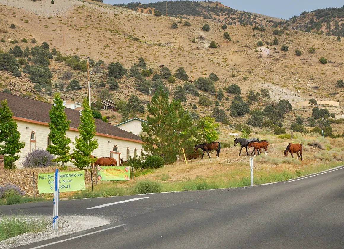 Die Landschaft links und rechts bleibt nicht minder skurril. Kurz darauf entdecken wir wilde Pferde, die seelenruhig vor einer Kirche grasen. Kirche. Pferde. Absolute Gelassenheit. Niemand scheint sich daran zu stören, am wenigsten die Pferde selbst. Ein Bild wie aus einem modernen Western, irgendwo zwischen Freiheit und Sonntagsschule.