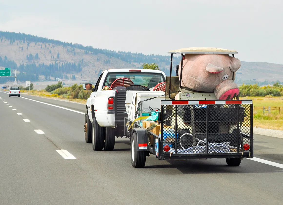 Schon kurz nach der Abfahrt liefert Amerika wieder genau das, was man hier liebt: Situationen, die man nicht erklären muss – nur fotografieren. Auf dem Highway vor uns fährt ein Pickup mit Anhänger. Darauf: ein überdimensionales Schwein. Kein Logo, kein Umzug, kein erkennbarer Zweck. Einfach ein riesiges Schwein auf amerikanischem Asphalt. Wir schauen uns an, grinsen und wissen: Ja. Genau deshalb fahren wir Roadtrip. Auf amerikanischen Highways ist einfach alles unterwegs. Und alles wirkt dabei völlig normal.