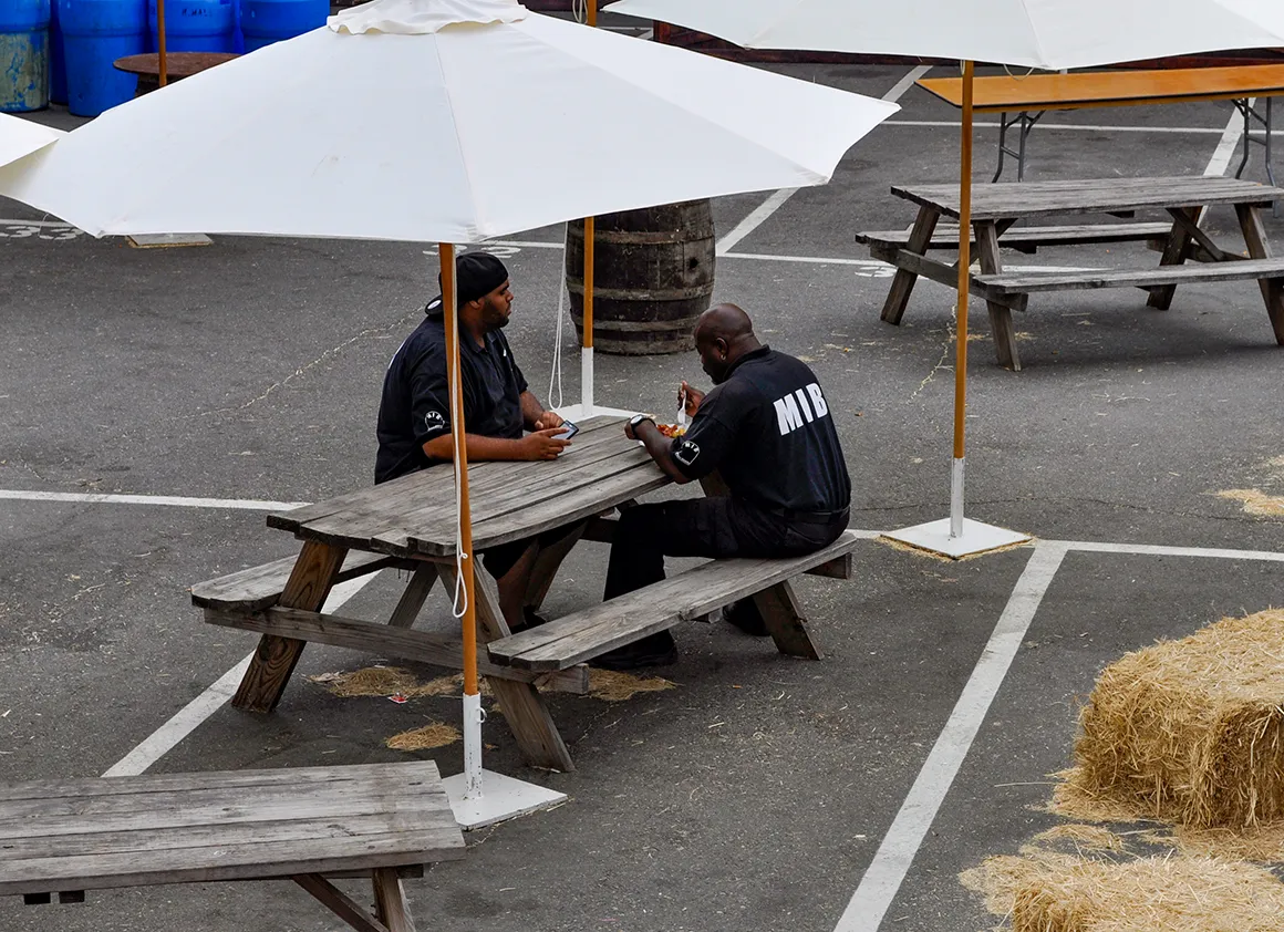 Schwarze Anzüge, schwarze Sonnenbrillen, komplett falscher Film. Offenbar hat jemand das Zeitportal nicht ganz korrekt eingestellt. Oder sie sind hier, um sicherzustellen, dass niemand merkt, dass wir gerade ziemlich viel Spaß im Jahr 1860 haben. So oder so: großartig. Mehr Kontrast geht kaum. Wir lassen uns treiben, schauen, staunen, bleiben stehen, gehen weiter. Old Sacramento lebt heute nicht Geschichte – es spielt sie. Und wir spielen sehr gern mit.