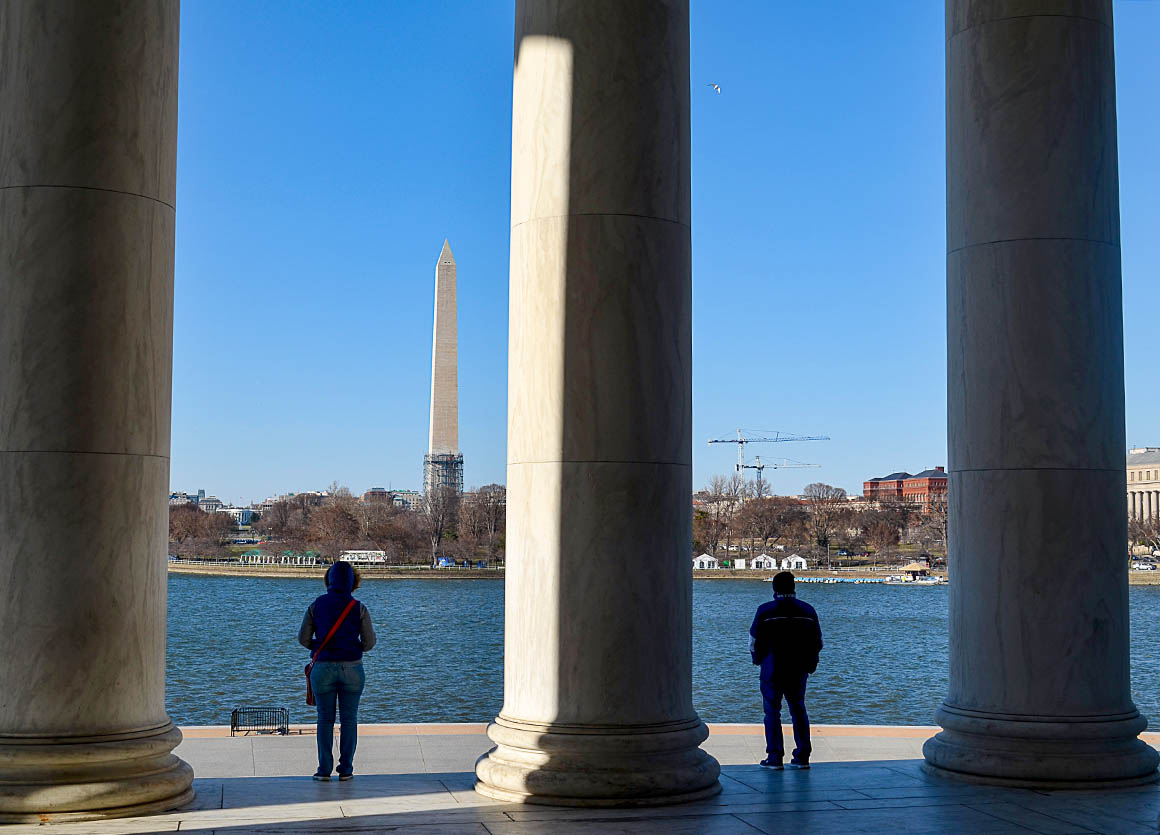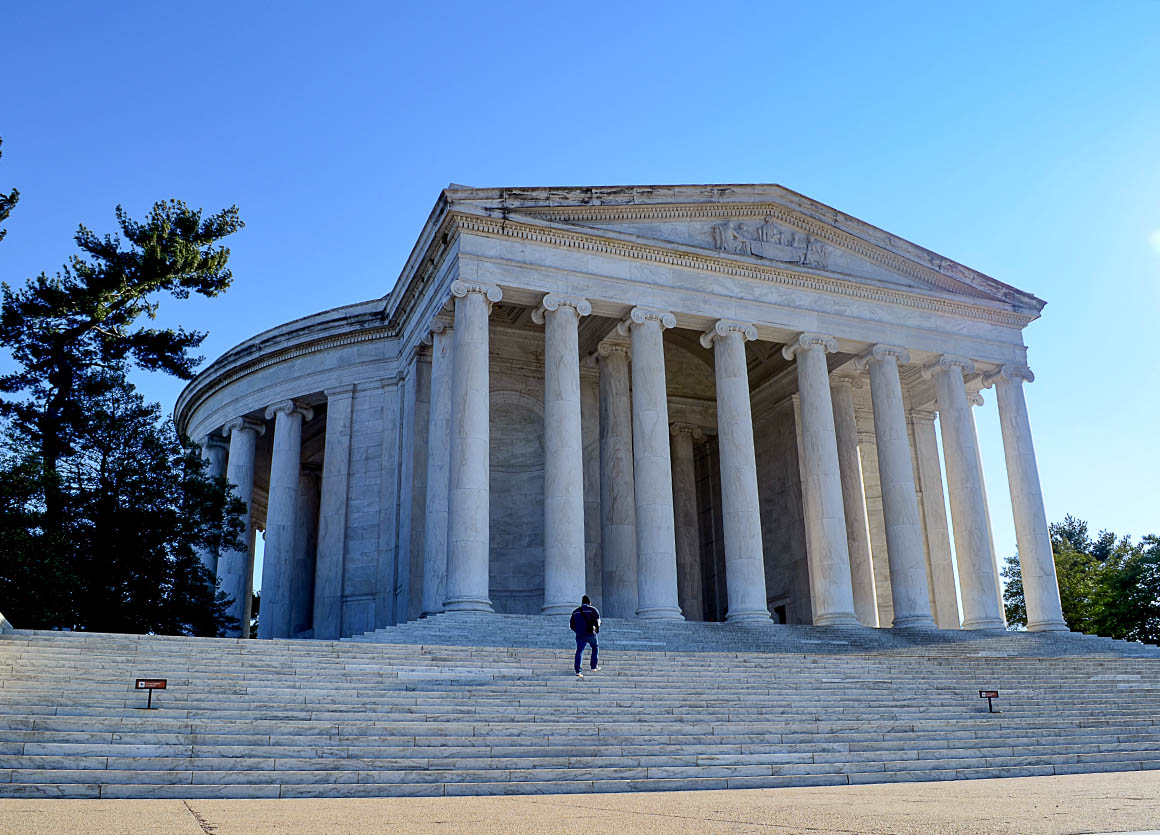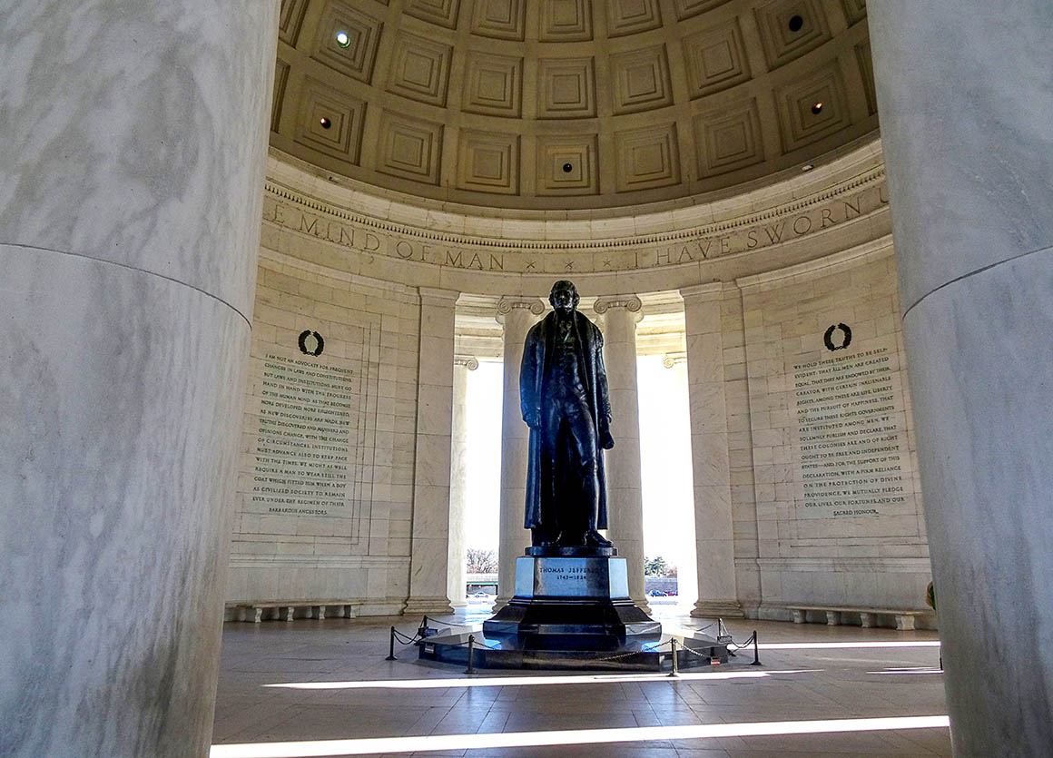 Das Jefferson Memorial steht etwas abseits, direkt am Ufer des Potomacs. Der Bau des Memorials dauerte von 1939 bis 1943. Die im Im Inneren stehende Jefferson Statue, die durch die Säulen hindurch auf das Weiße Haus blickt wurde 1947 aufgestellt. An den Wänden, welche die Statue umgeben, finden sich Auszüge aus den Reden und Schriften Thomas Jeffersons eingraviert in den weißen Marmor.