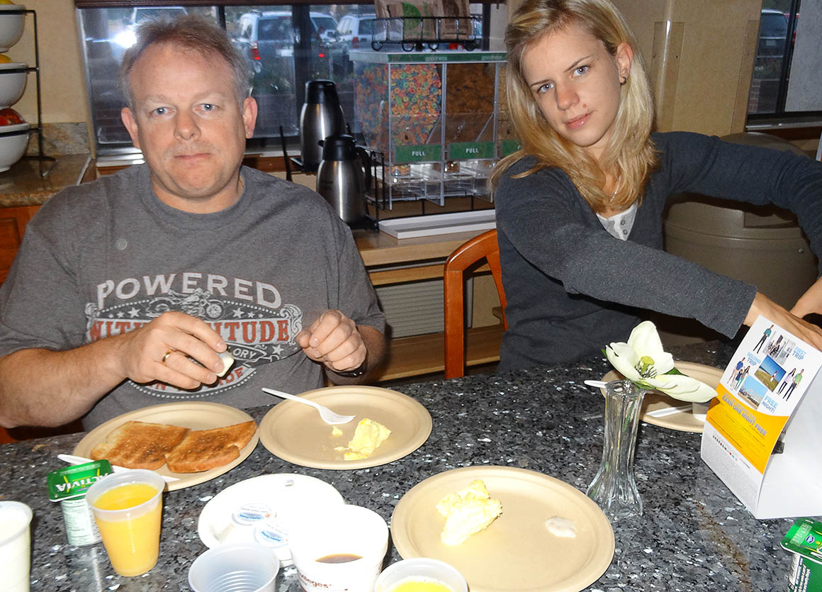 Auf dem Rückweg vom Auto, voller Tatendrang, begrüßte ich den verschlafenen Portier mit einem besonders fröhlichen „Good Morning“, in der festen Überzeugung, dass er jetzt endlich mit den Frühstücksvorbereitungen starten würde. Doch zurück im Zimmer kam der Schock: Meine Familie lag noch immer tief und fest im Bett! Verwundert blickte ich Stefan an, der nur leicht genervt murmelte: „Was ist los mit dir? Es ist erst 4 Uhr morgens!“