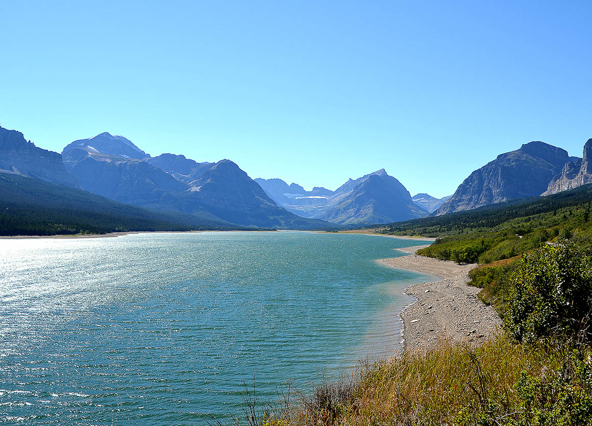 Die Zufahrt zum Park allein ist ein wahres Naturspektakel! Das tiefblaue Wasser des Lake Sherburne vor der majestätischen Kulisse der Berggipfel – einfach atemberaubend. Der knackig blaue Himmel, der sich über uns erstreckt, verstärkt den Eindruck einer perfekt inszenierten Landschaft.