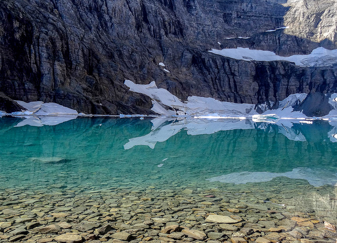 Wir begeben uns direkt ans Ufer des Iceberg Lake, setzen uns auf die Felsen und lassen die Umgebung auf uns wirken. Der Anblick ist einfach magisch – die glasklare Wasseroberfläche, die schimmernden Eisschollen, die still vor uns treiben, und die massiven, schneebedeckten Felsen im Hintergrund bilden eine Kulisse, die fast unwirklich erscheint. Die Ruhe und Stille des Ortes hüllen uns ein, und für einen Moment scheint die Welt stillzustehen.