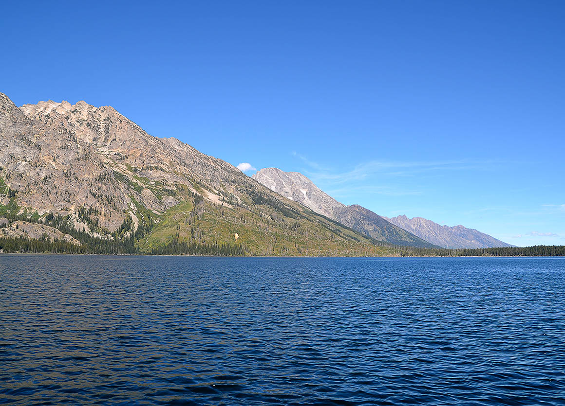 Der Highway führt uns weiter, vorbei am malerischen Jackson Lake und dem beeindruckenden Jackson Lake Dam. Die spiegelglatte Oberfläche des Sees und die majestätischen Tetons im Hintergrund schaffen eine Szenerie, die einfach unvergleichlich ist. Jeder Ausblick wirkt wie eine Postkarte, und natürlich zücken wir immer wieder die Kamera, um diese atemberaubenden Momente festzuhalten.