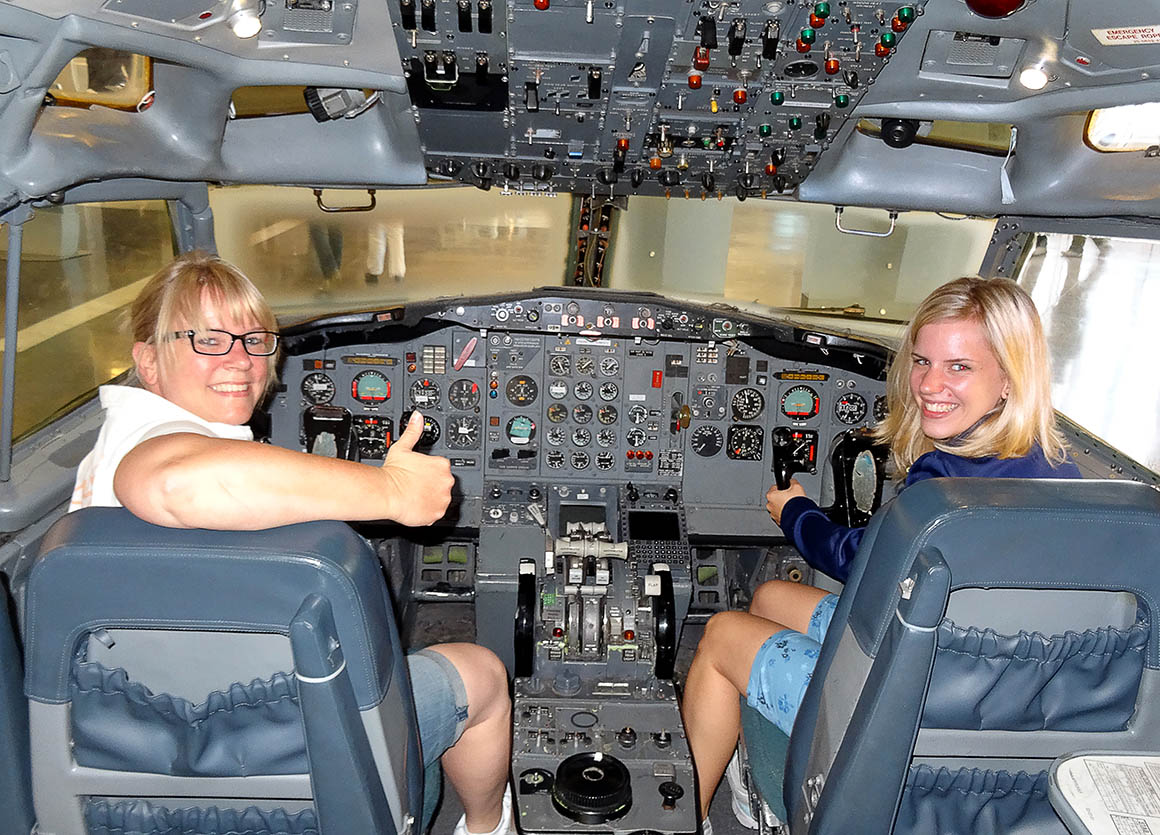 Besonders aufregend wird es, als wir uns in ein echtes Cockpit setzen dürfen. Ein Moment, der uns ganz nah an das Gefühl heranbringt, das Piloten in tausenden Metern Höhe erleben. Die unzähligen Knöpfe und Schalter, das enge Cockpit und die Aussicht auf die Welt da draußen lassen unsere Herzen schneller schlagen – und das Abenteuer Boeing Factory hat gerade erst begonnen!