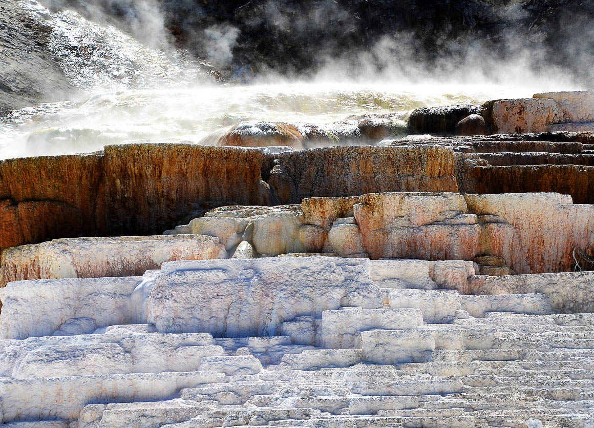 Während wir uns die Terrassen von Mammoth Hot Springs ansehen, fühlen wir uns, als wären wir in ein anderes Reich der Natur eingetaucht. Vor uns erstreckt sich die Lower Terrace, und gleich zu Beginn fällt uns die Minerva Terrace ins Auge. Ihre filigranen Kalkablagerungen leuchten in der Sonne, als ob das porzellanartige Gestein von innen heraus glühen würde. Die Schichten, die sich über die Jahre gebildet haben, formen eine kunstvolle Struktur, die uns mit ihren Gelb- und Orangetönen fasziniert. Wir stehen still und bewundern die Details dieser lebendigen Formation. Jeder Schritt, den wir auf dem Boardwalk machen, zeigt uns neue Perspektiven und Farbenspiele.