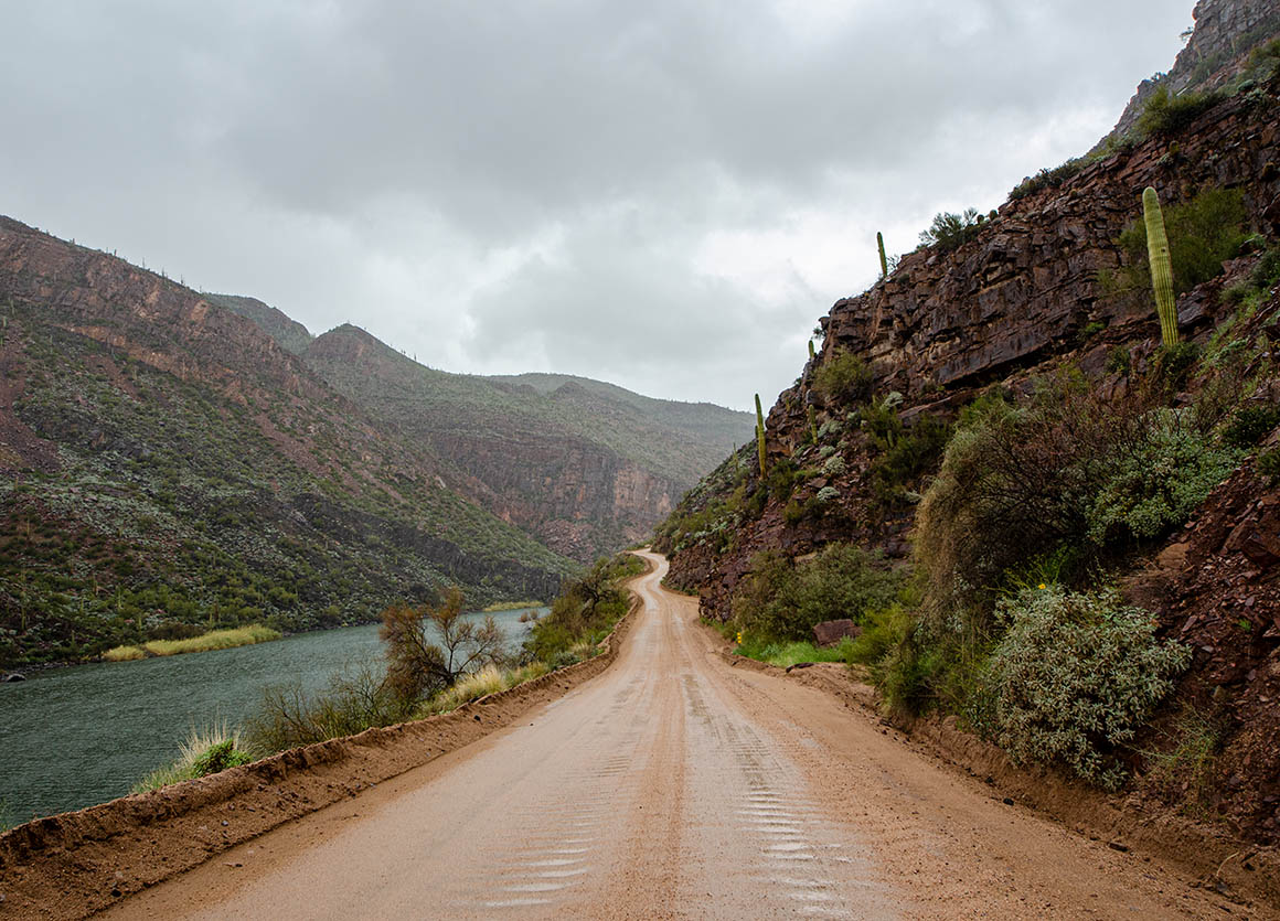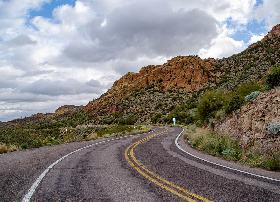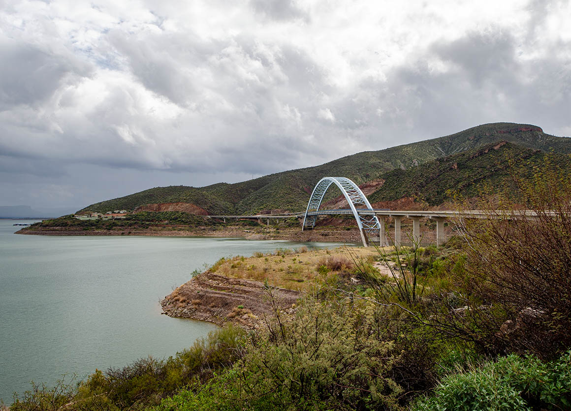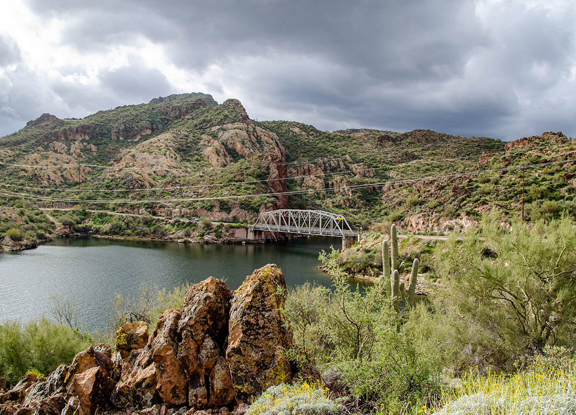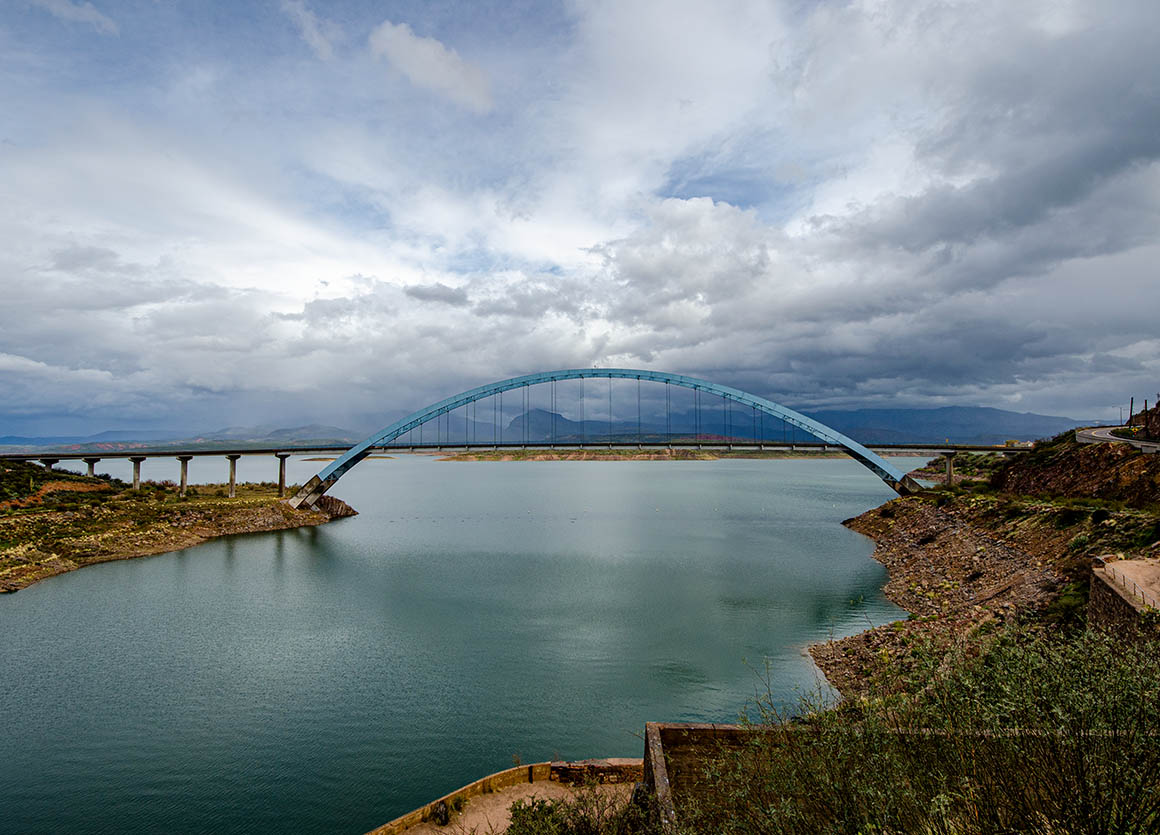 Zeitweise lässt uns das Wetter im Stich. Ab und zu erwischt uns ein Regenschauer. Der Himmel ist voller dunkler Wolken – lässt aber manchmal auch ein bisschen blau durchschimmern. Am Roosevelt Dam angekommen fahren wir nach Norden bis Tonto Basin.