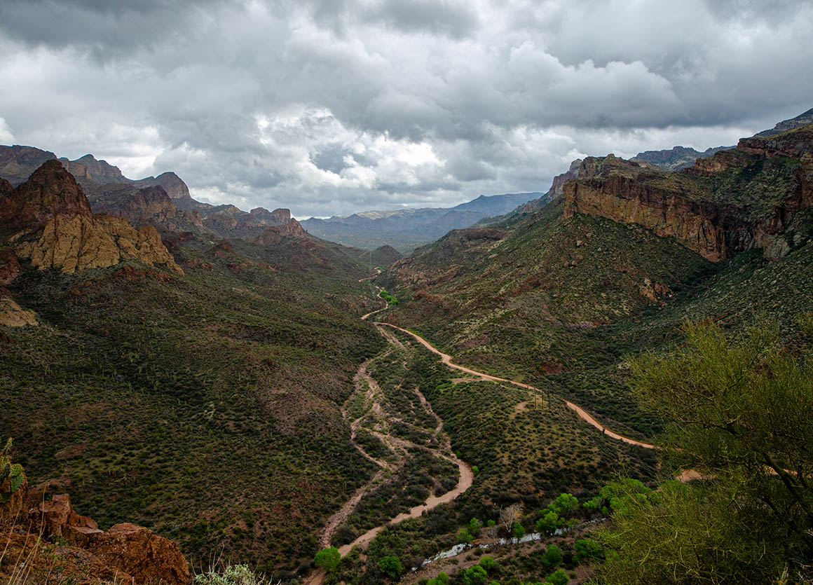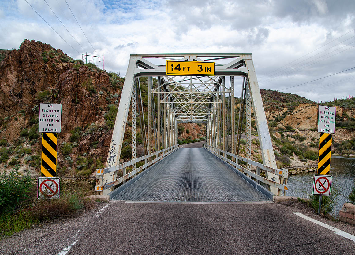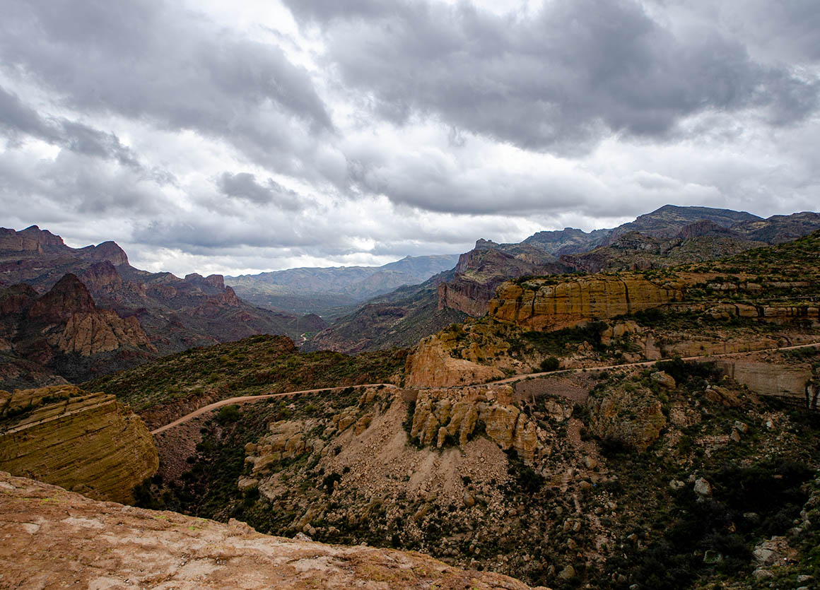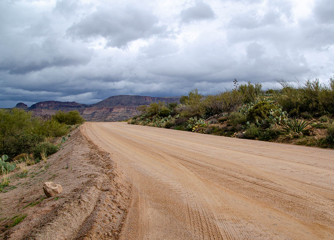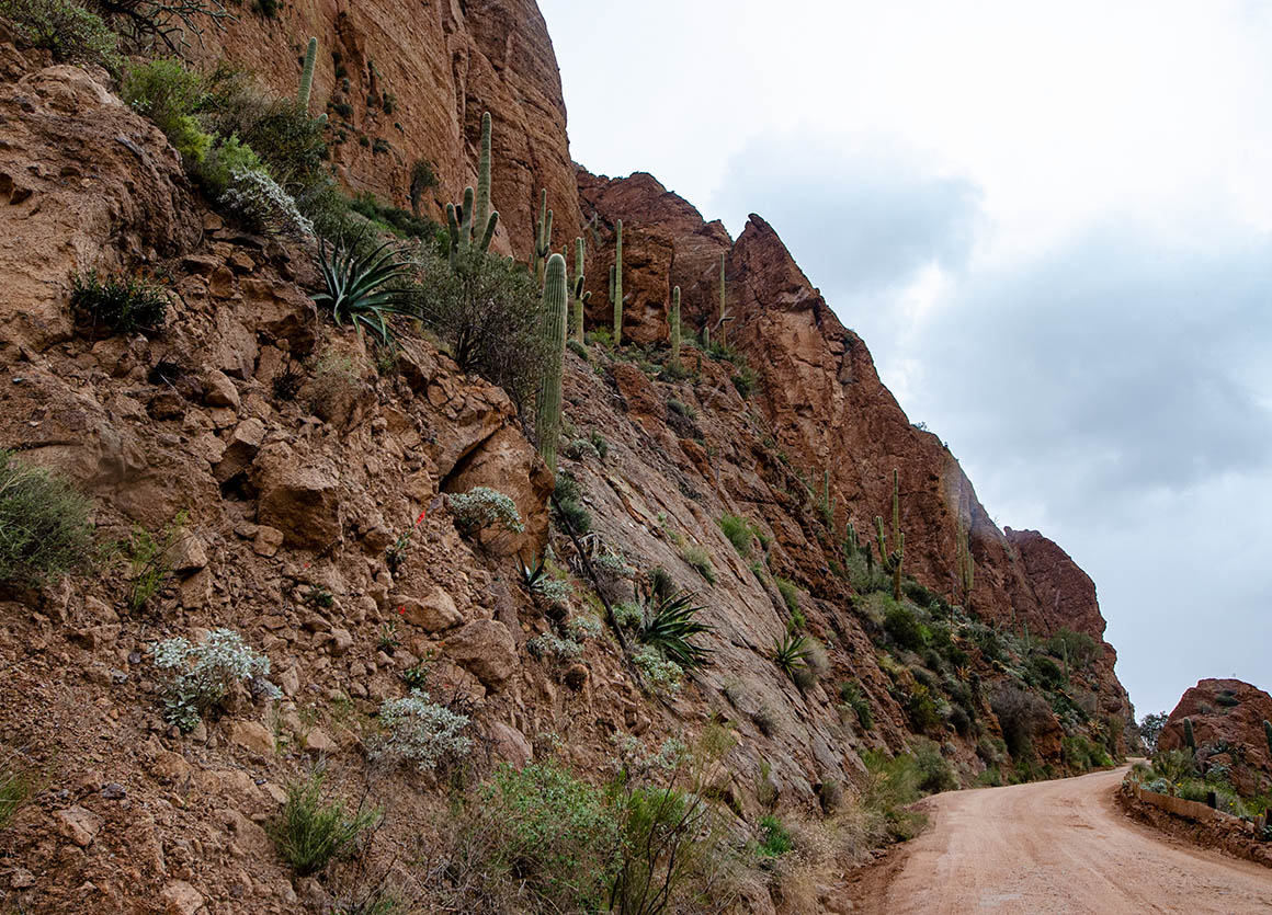 Zeitweise lässt uns das Wetter im Stich. Ab und zu erwischt uns ein Regenschauer. Der Himmel ist voller dunkler Wolken – lässt aber manchmal auch ein bisschen blau durchschimmern. Am Roosevelt Dam angekommen fahren wir nach Norden bis Tonto Basin.
