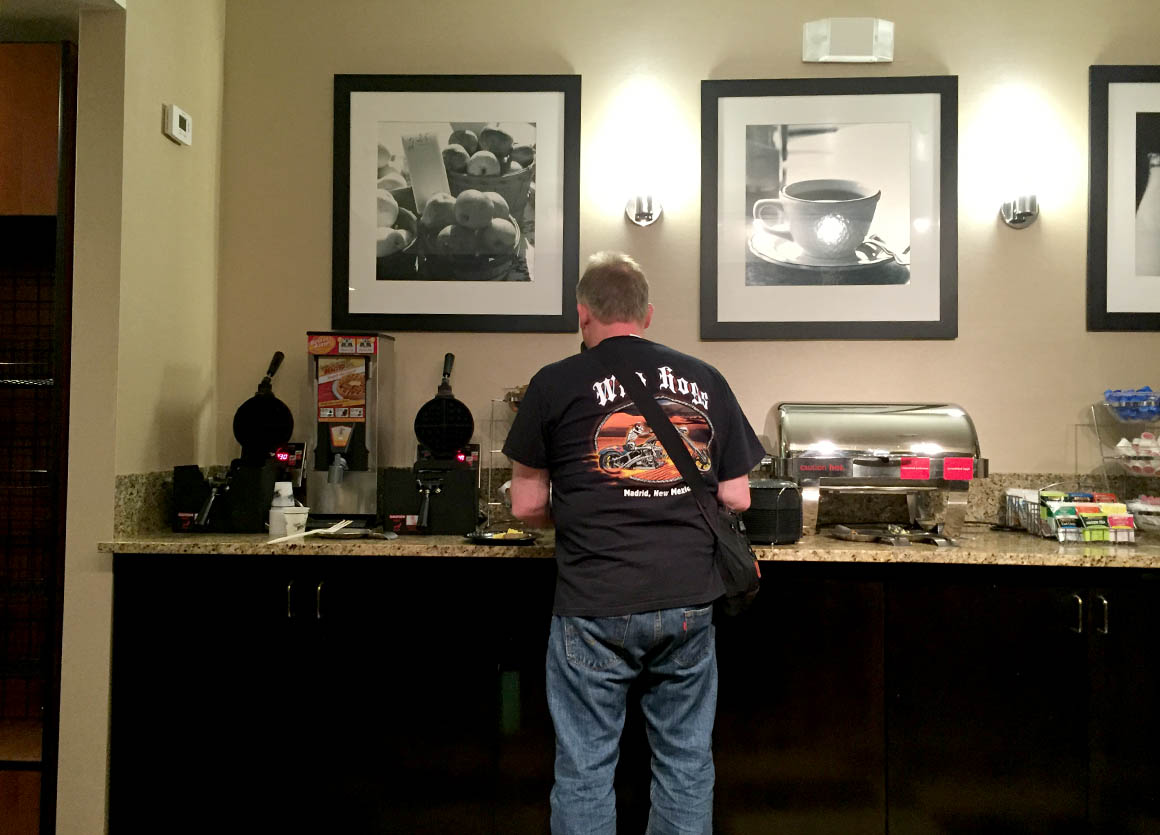 Das Frühstück im Hotel ist vielseitig und wir essen uns in aller Ruhe satt. Es gibt neben den üblichen Bagels, Cheese Cream und Marmelade auch Waffeln, Rührei und Würstchen.