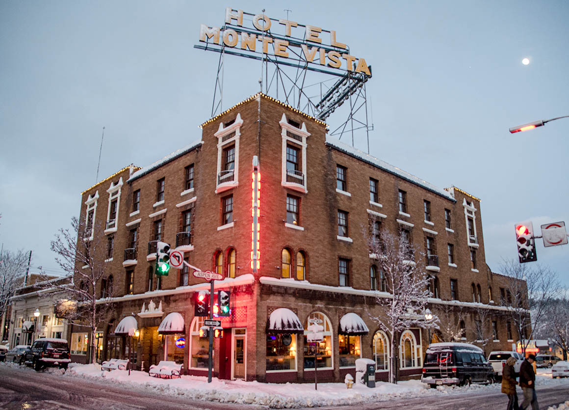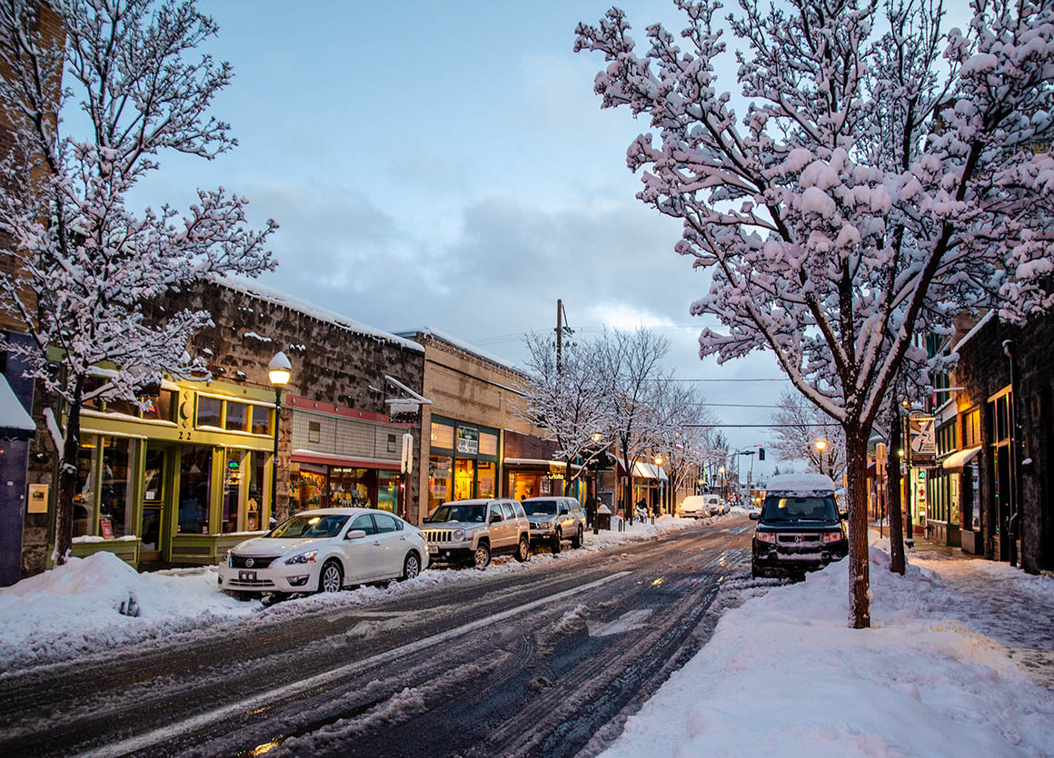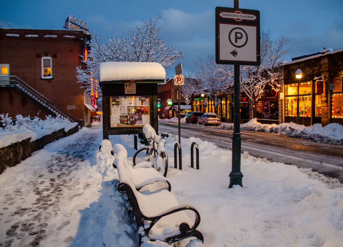Ein wenig später als geplant kommen wir in Flagstaff an und sind inmitten einer wunderschönen, glitzernden Winterlandschaft. Wir parken unseren Wagen direkt in der kleinen Downtown und bummeln durch den unter unseren Füßen knirschenden Schnee.