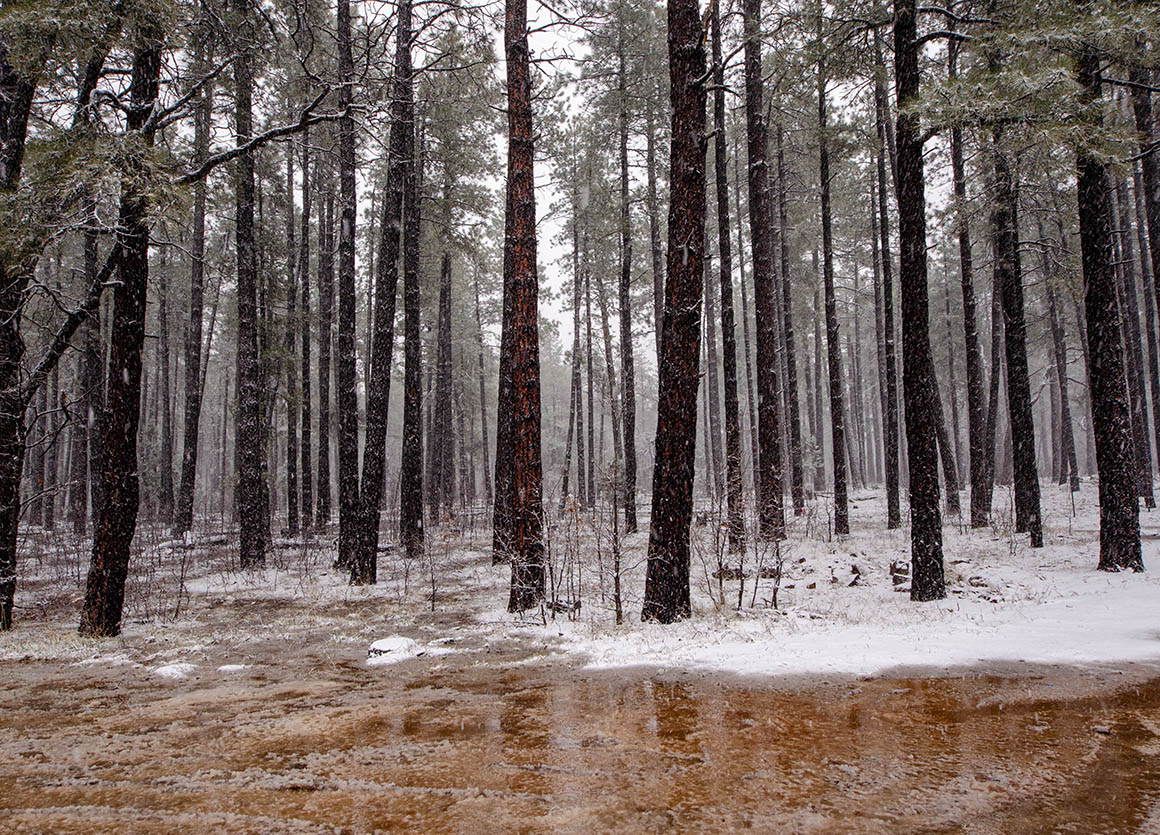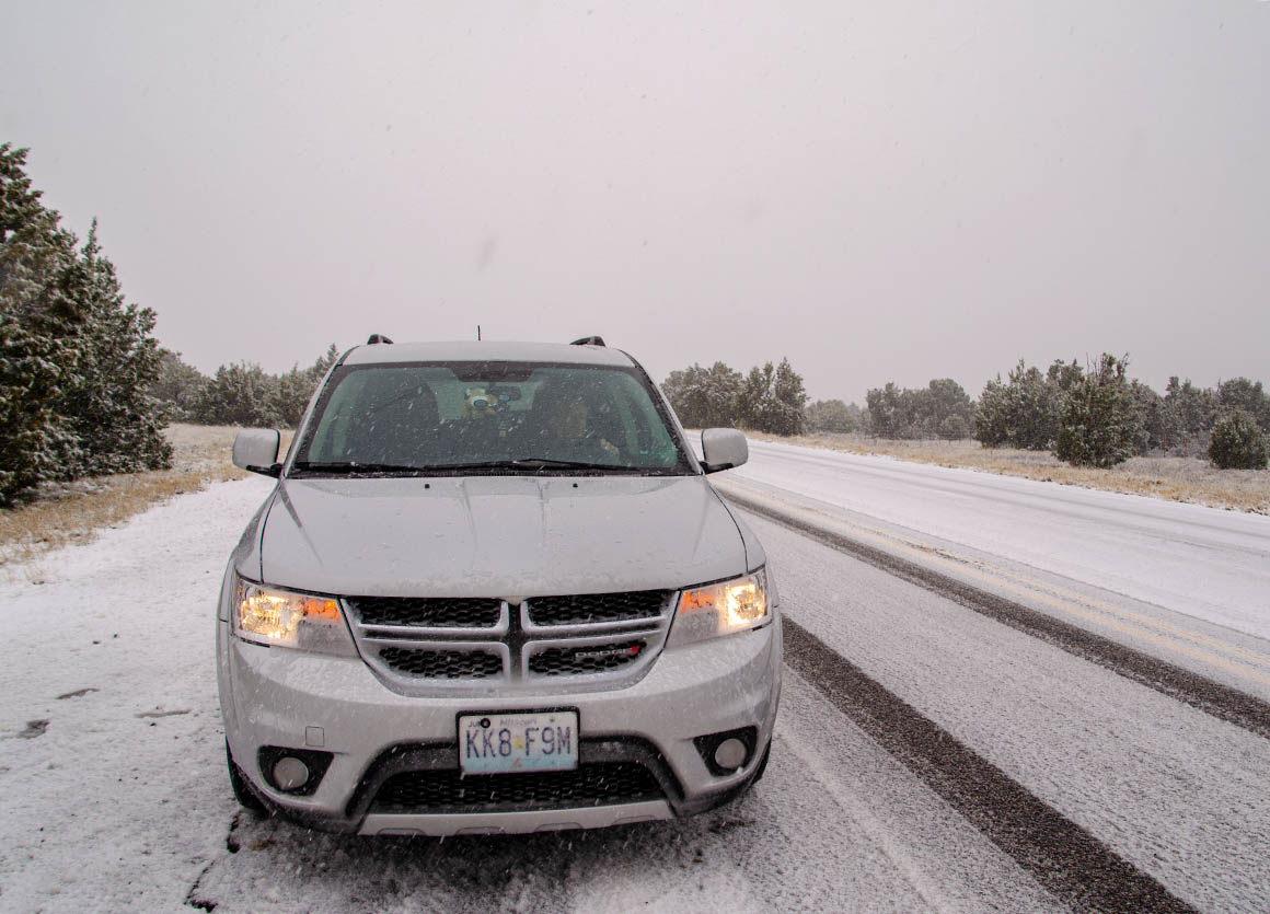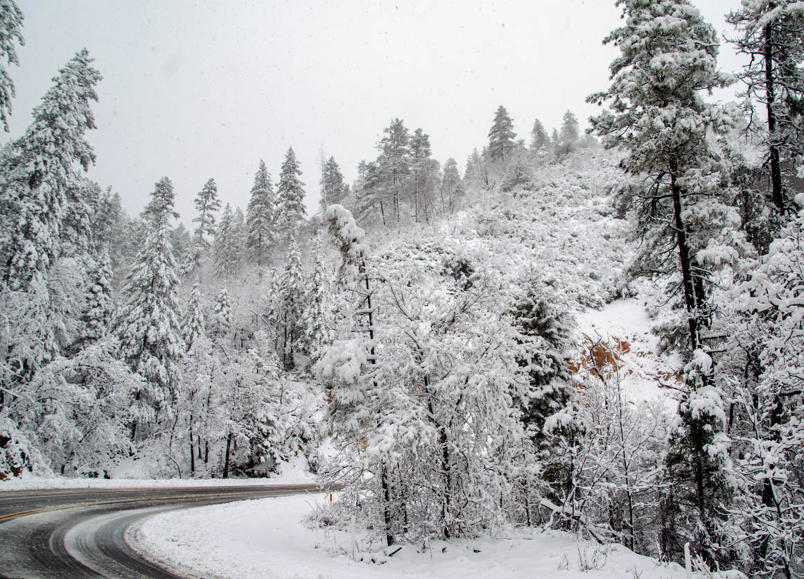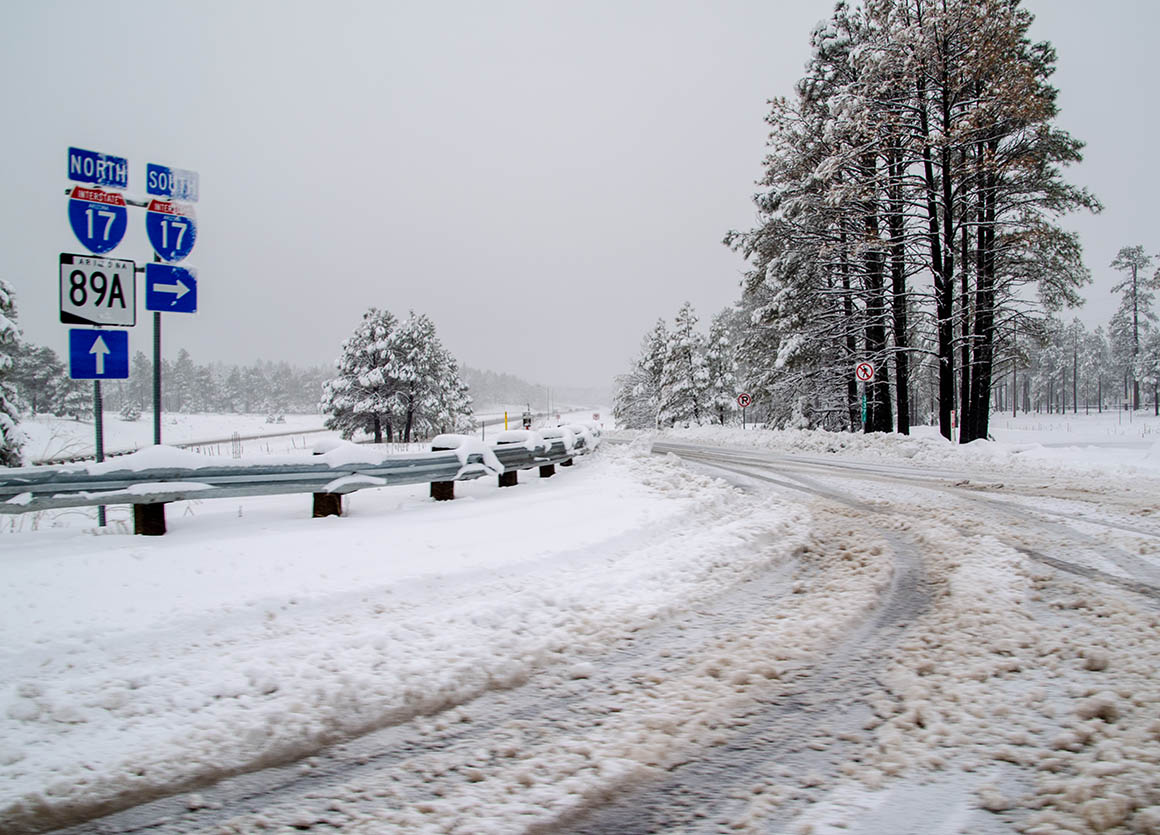 Nach Flagstaff sind es nur noch 80 Meilen. Auf der Hälfte des Weges fängt es wieder heftig an zu schneien. Es geht nur langsam voran, vor allem als wir dann hinter einem Streufahrzeug her tuckelten. Aber so war wenigstens die Straße schön aufbereitet.