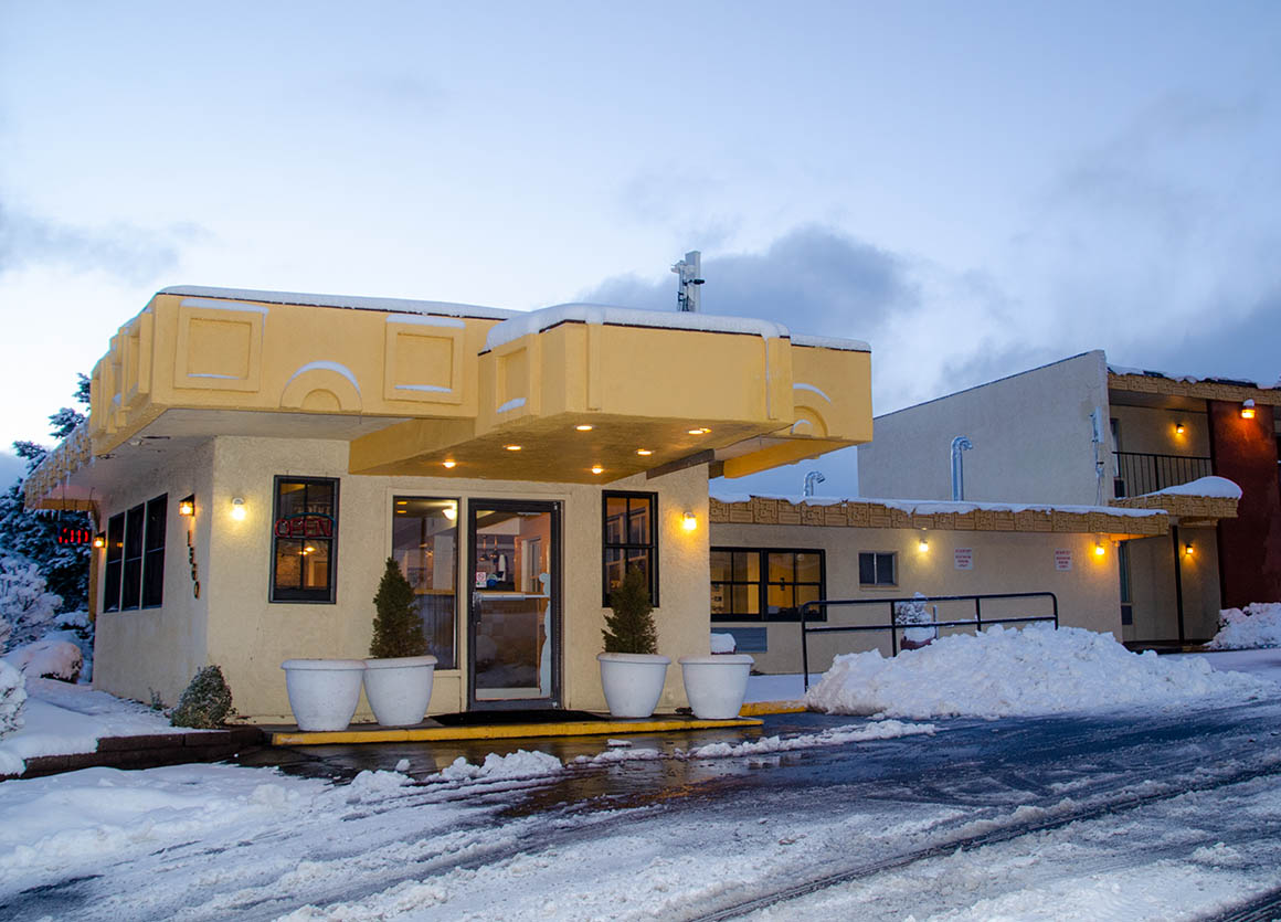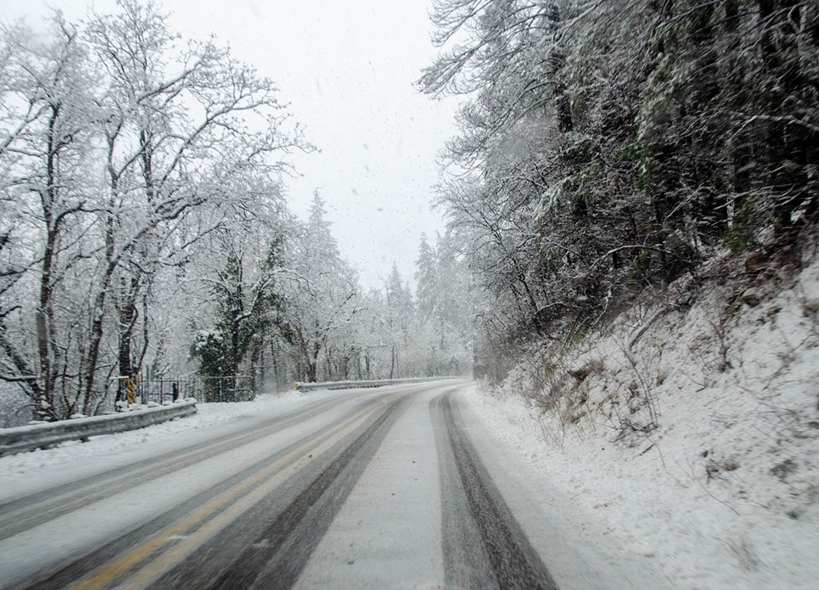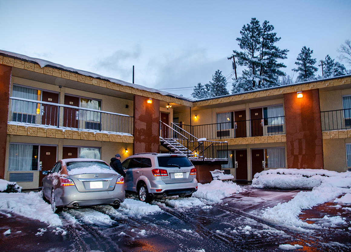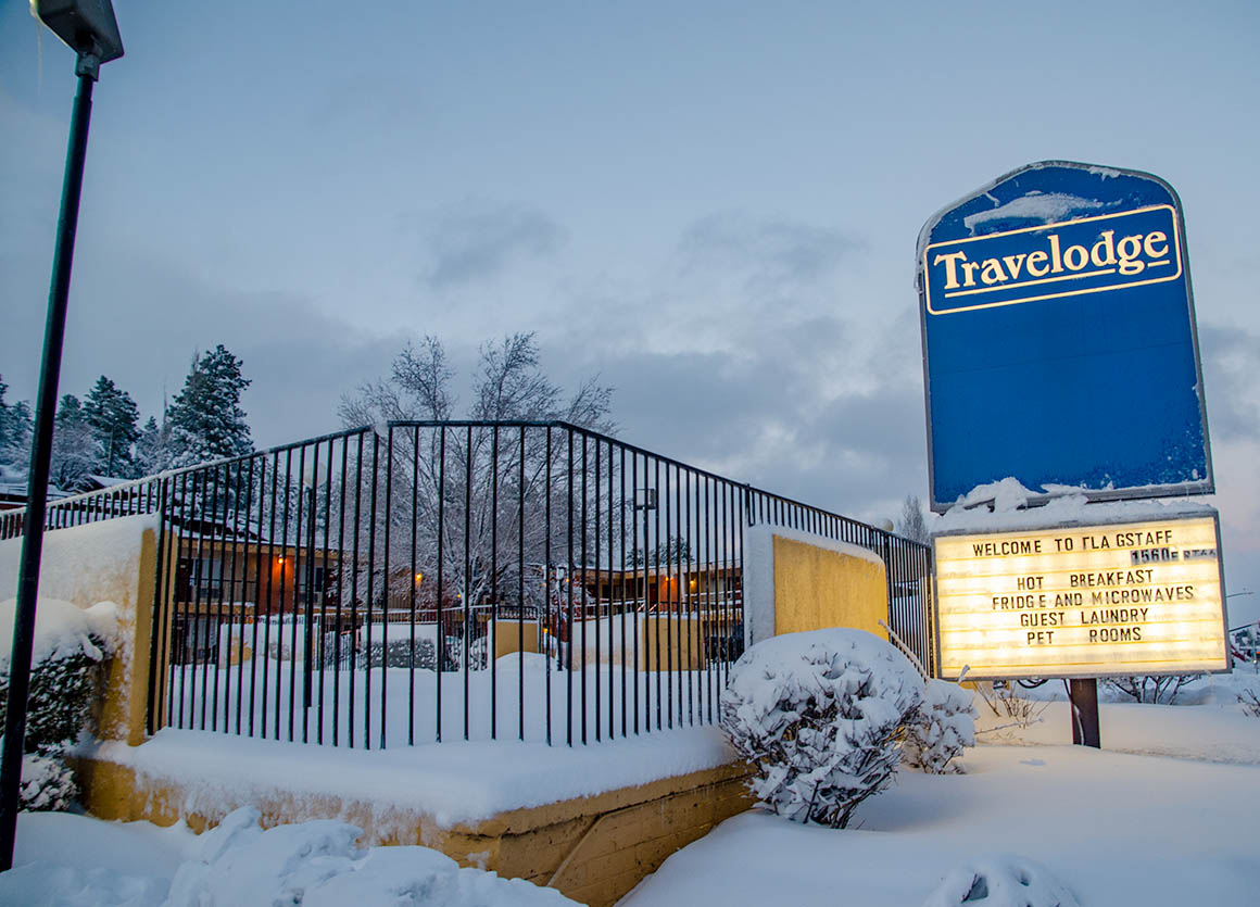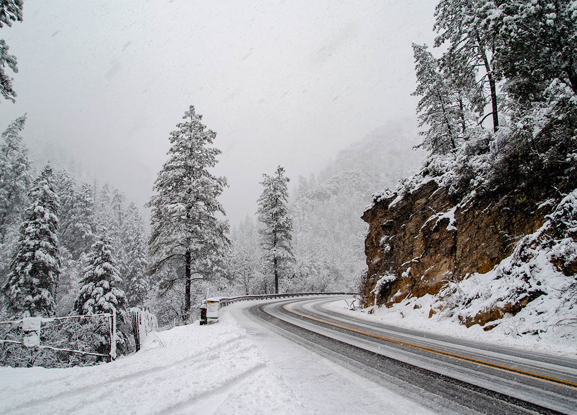 Nach Flagstaff sind es nur noch 80 Meilen. Auf der Hälfte des Weges fängt es wieder heftig an zu schneien. Es geht nur langsam voran, vor allem als wir dann hinter einem Streufahrzeug her tuckelten. Aber so war wenigstens die Straße schön aufbereitet.
