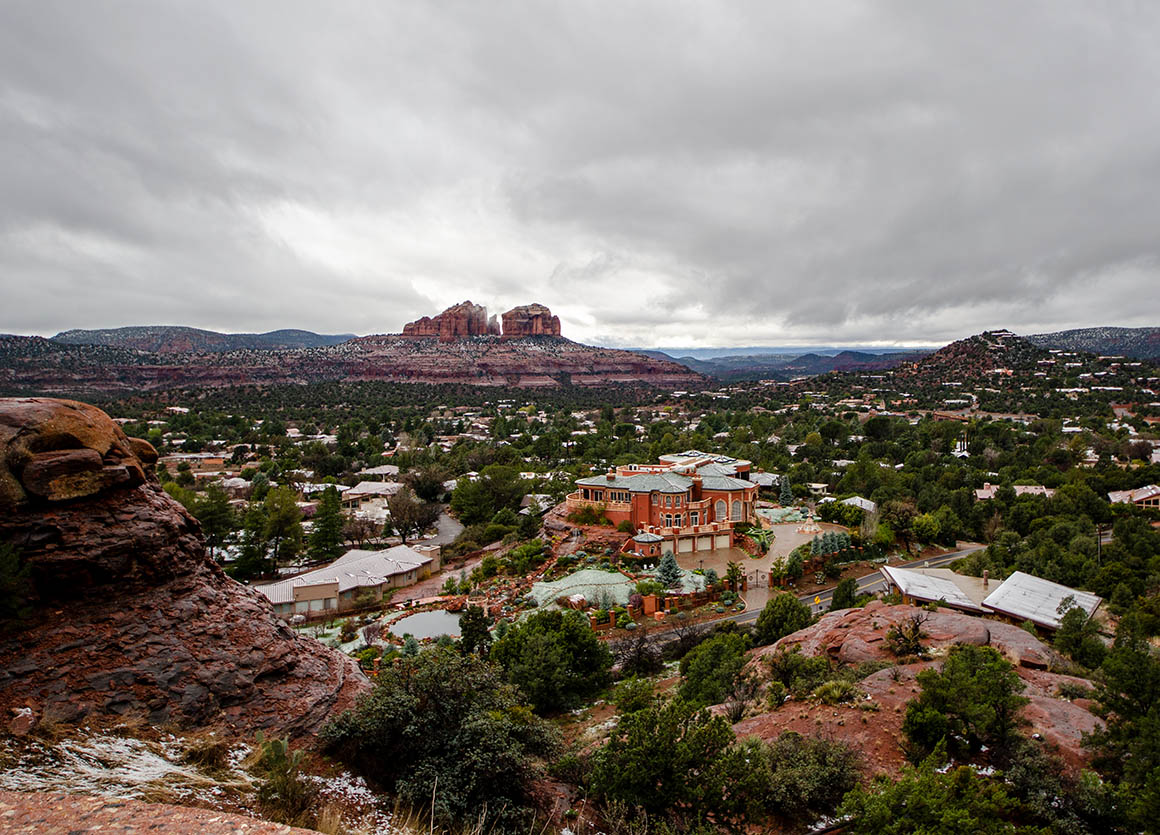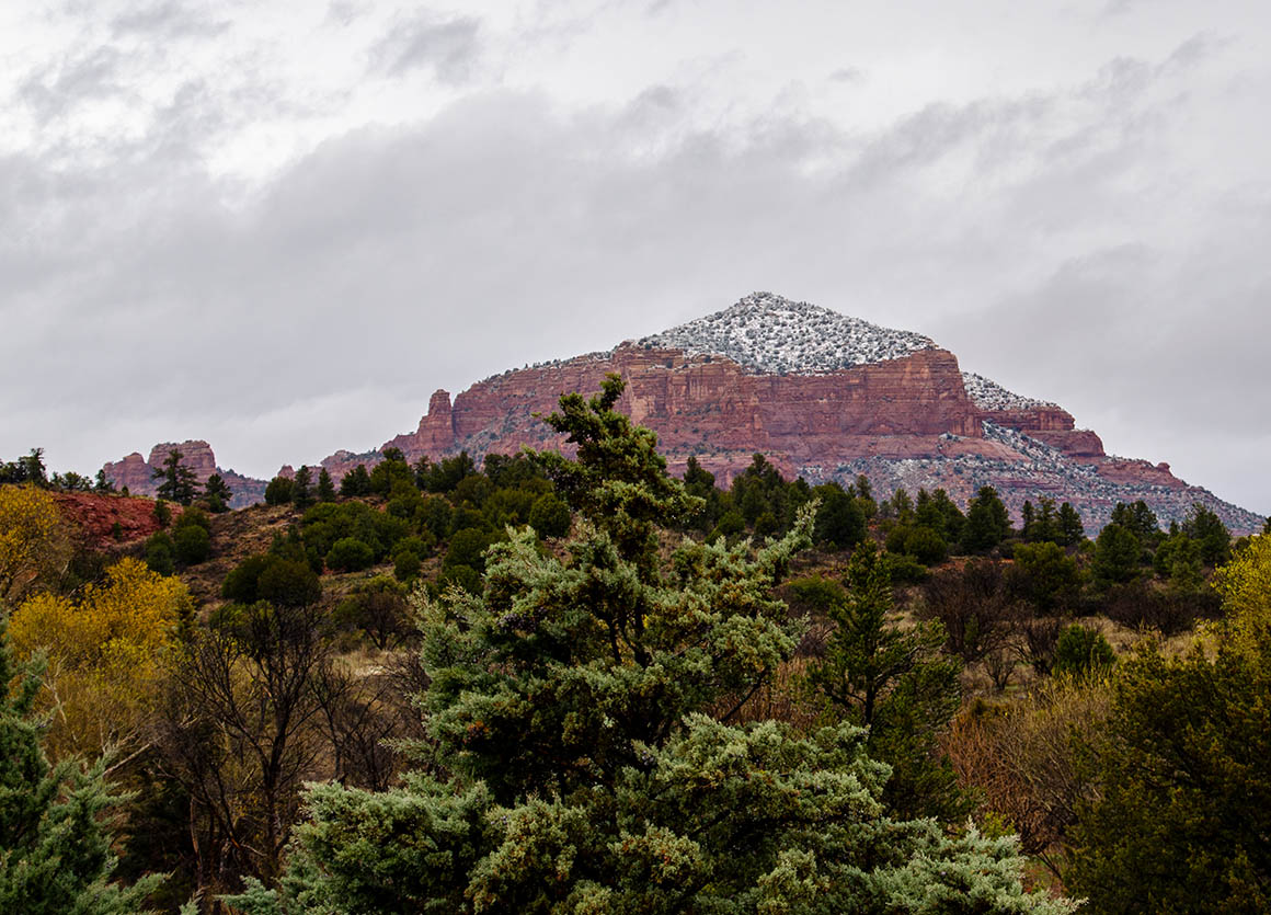 Ein schöner Ort, dieses Sedona. Kleine Geschäfte und wunderschöne rote Felsen. Wir müssen hier unbedingt noch einmal hin, wenn der Himmel blau ist. Ein paar (trübe) Fotostopps später fahren wir weiter in nördliche Richtung.