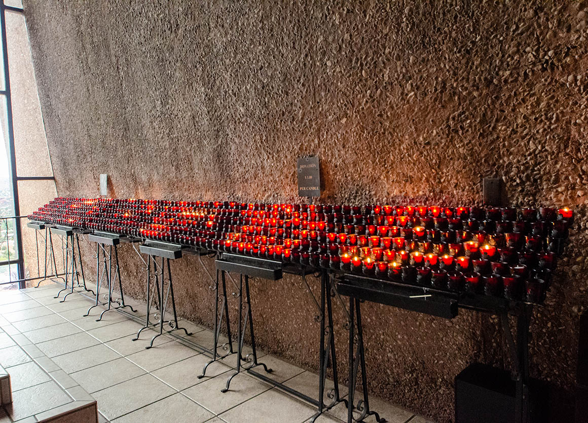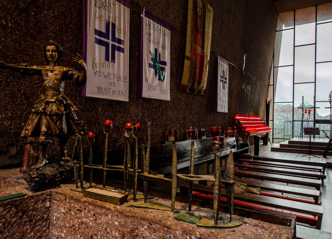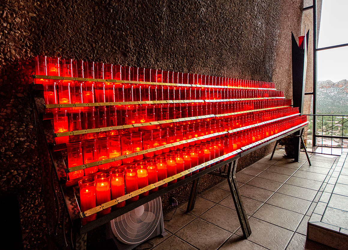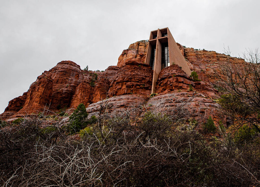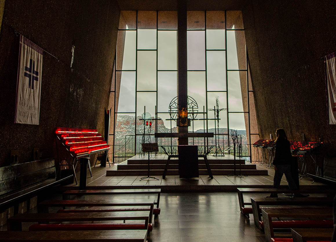 Na dann gehen wir eben in die Kirche. Die „Chapel Of The Holy Cross“ liegt auf einer Anhöhe mit einem fantastischen Ausblick auf Sedona. Auch das Innere der Kirche ist schön gestaltet. Große Fenster hinter dem Altar ermöglichen einen atemberaubenden Blick auf die „Red Rocks“ und auf die schicken Villen von Sedona.
