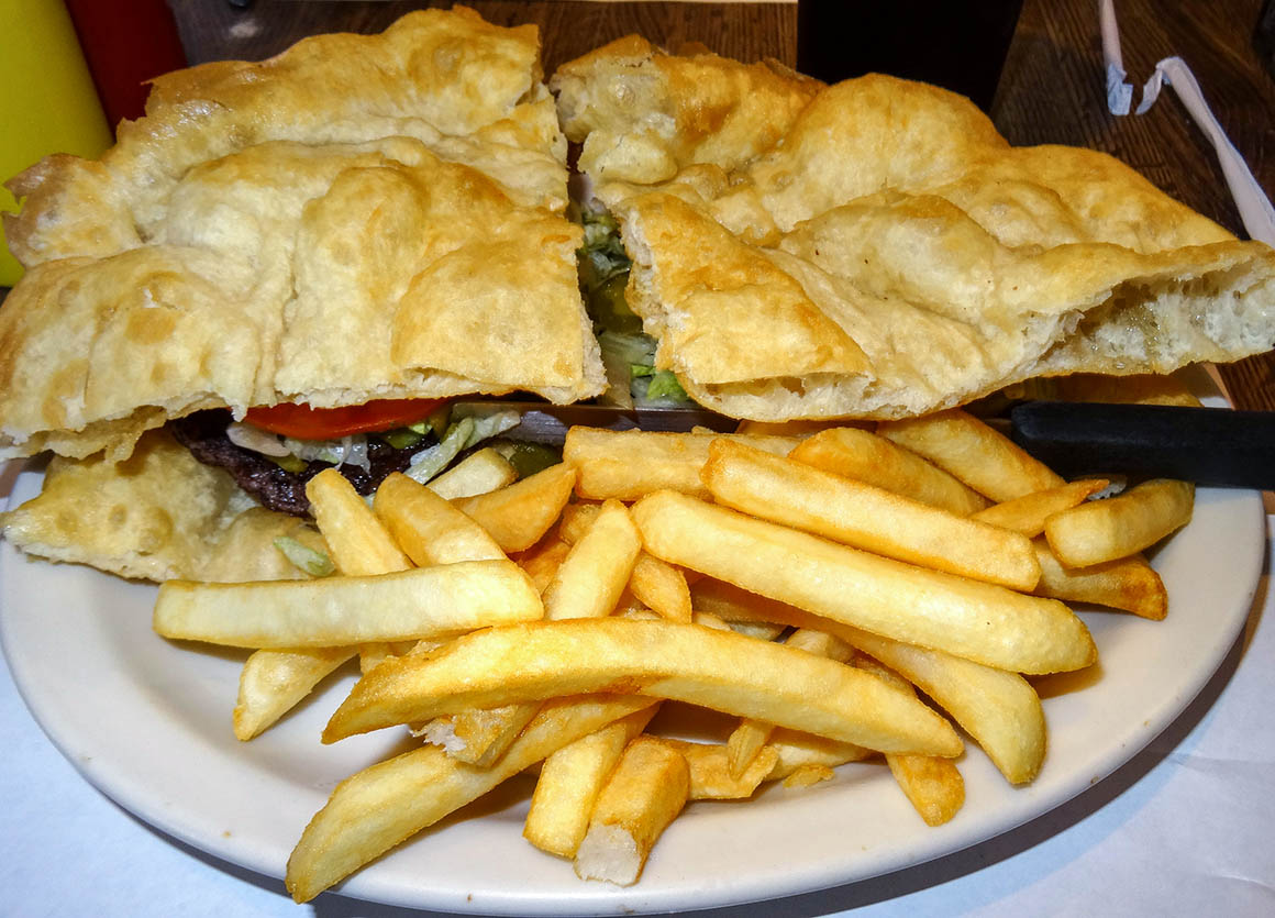 Wir bestellen Navajo Burger auf „Fried Bred“ … die schmecken extrem lecker!! Dann fahren wir die restliche Strecke zum Monument Valley.