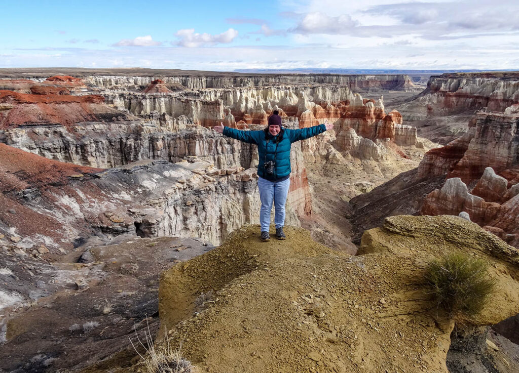 Wir kommen aber problemlos am südlichen Aussichtspunkt das Coal Mine Canyon an. Wow, das würde man gar nicht denken, dass sich hier so ein farbenfroher Canyon befindet. Der Boden auf dem wir zur Canyon-Abbruchkante laufen ist weich und wir sinken tief in den roten Matsch ein. Armes Auto, denn da müssen wir mit den Schmuddel-Schuhen nun wieder rein. Oh je.