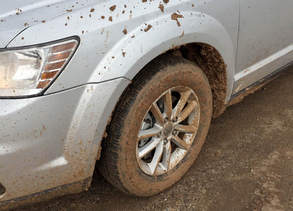 Jedenfalls standen wir wieder halbwegs in Fahrtrichtung. Schrägstehend und schlammspritzend erreichten wir die gerade mal 100 Meter entfernte asphaltierte Straße. Puhh, das war spannend. Aber unser Auto sah aus – igitt!
