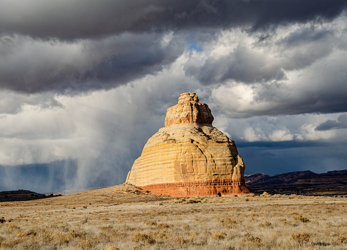 Bis Mexican Hat haben wir noch blauen Himmel, der sich dann aber ziemlich schnell zuzieht. Kurz vor den Serpentinen des Moki Dug Highway gießt es in strömen. Heute haben wir aber auch ein Pech mit dem Wetter. Oben angekommen schauen wir hinab auf dichte Regenwolken. So streichen wir nun auch den Mulepoint Highway von der Liste. Mist! Ist nicht unser Tag heute!