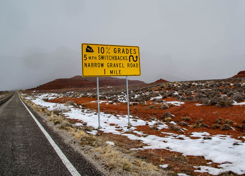 Nächster Stopp sollte nun die nördliche Seite des Canyons sein. Dazu fahren wir auf dem Highway 264 weitere 5 km. Zum Canyon führt die Dirt Raod steil hinunter. Es ist sehr matschig und rutschig; so entscheiden wir uns hier lieber nicht runter zu fahren. Wer weiß ob wir wieder rauf kommen, die Straße ist einfach zu nass.