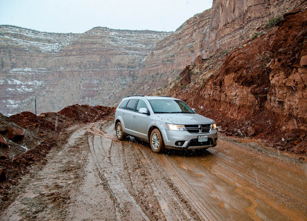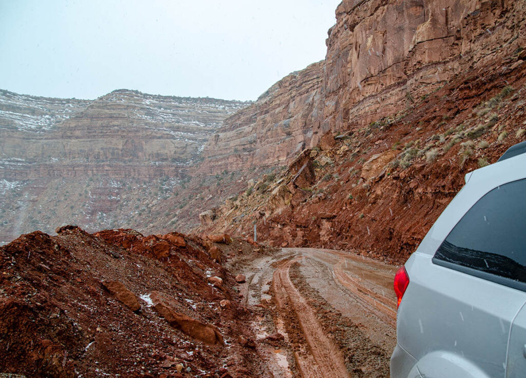Wieder geht es nach links auf eine breite Dirt Road. Wir überqueren ein Cattle Guard. Unmittelbar danach machte unser SUV auch schon nicht mehr das, was wir wollten. Anstatt geradeaus schlitterten wir nach rechts und wären beinahe festgesteckt. Die Straße war für unseren Wagen leider unbefahrbar.