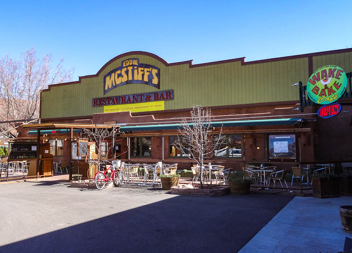 Dann wird es langsam Zeit den Park wieder zu verlassen. Bevor wir weiterfahren, wollen wir in Moab noch Mittagessen. Dafür haben wir uns leckere Burger bei Eddie McStiffs ausgesucht.