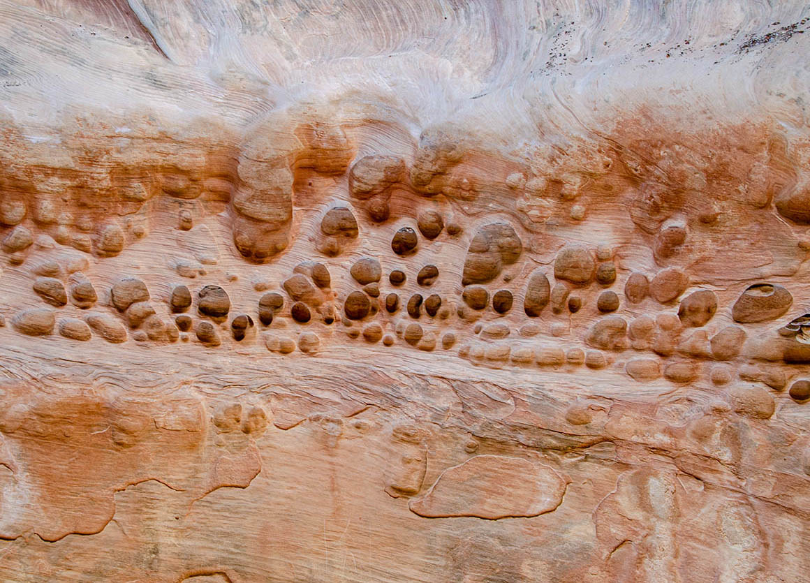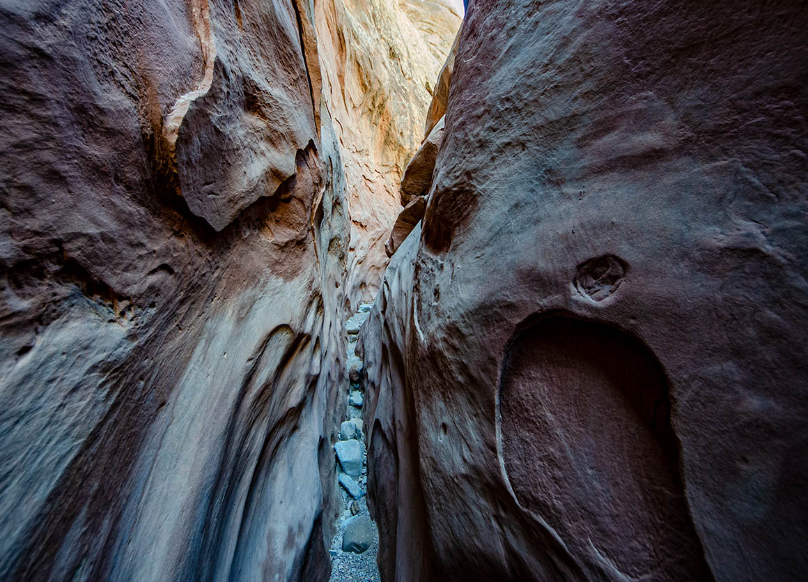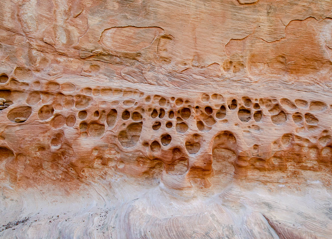 Nachdem diese kleine Hürde überwunden ist, erreicht man den Punkt, wo der Little Wild Horse- und der Bell Canyon aufeinander treffen. Wir halten uns rechts und kommen schon bald an den berühmten Löchern in der Wand vorbei. Ein witziger Effekt entsteht wenn man das Foto um 180° dreht.