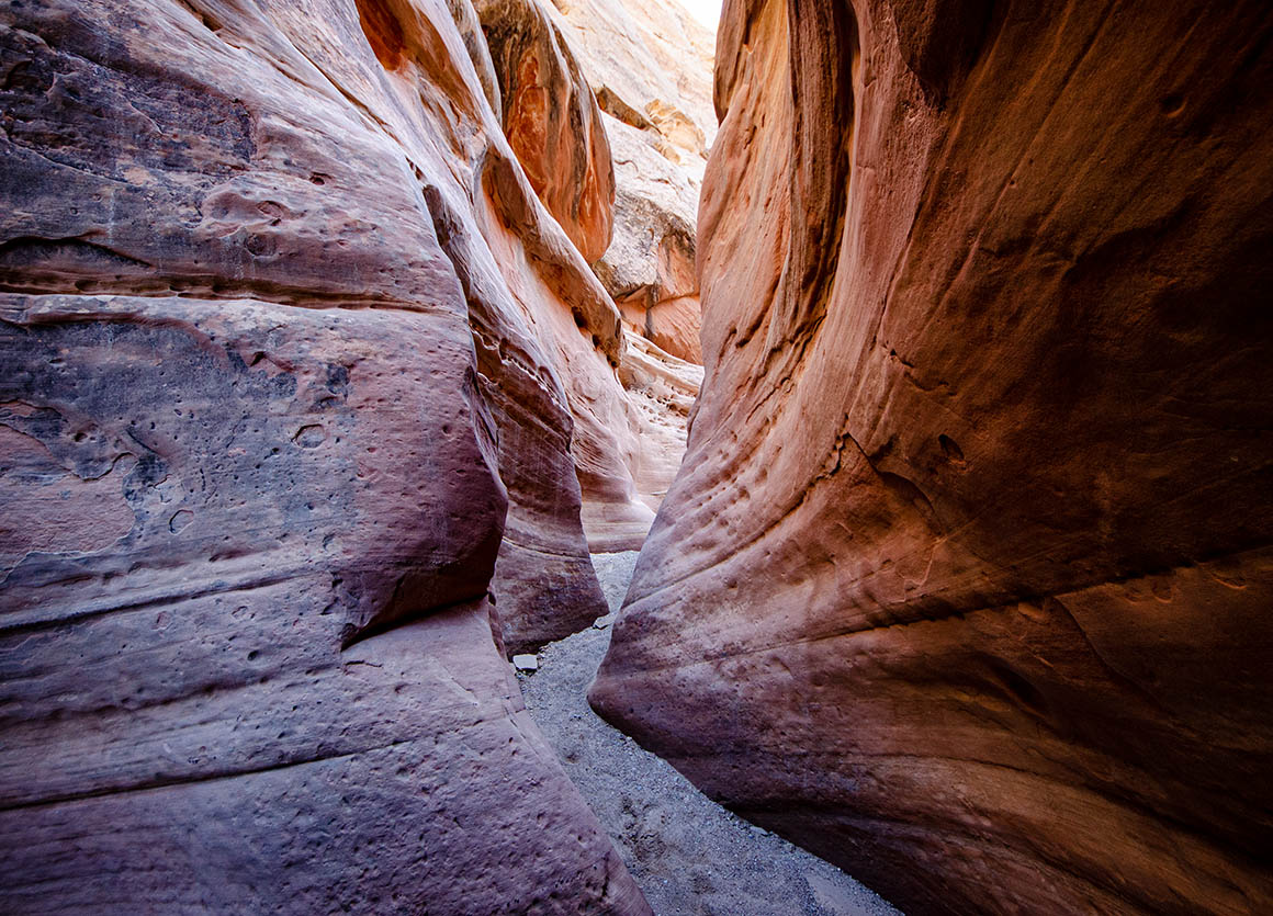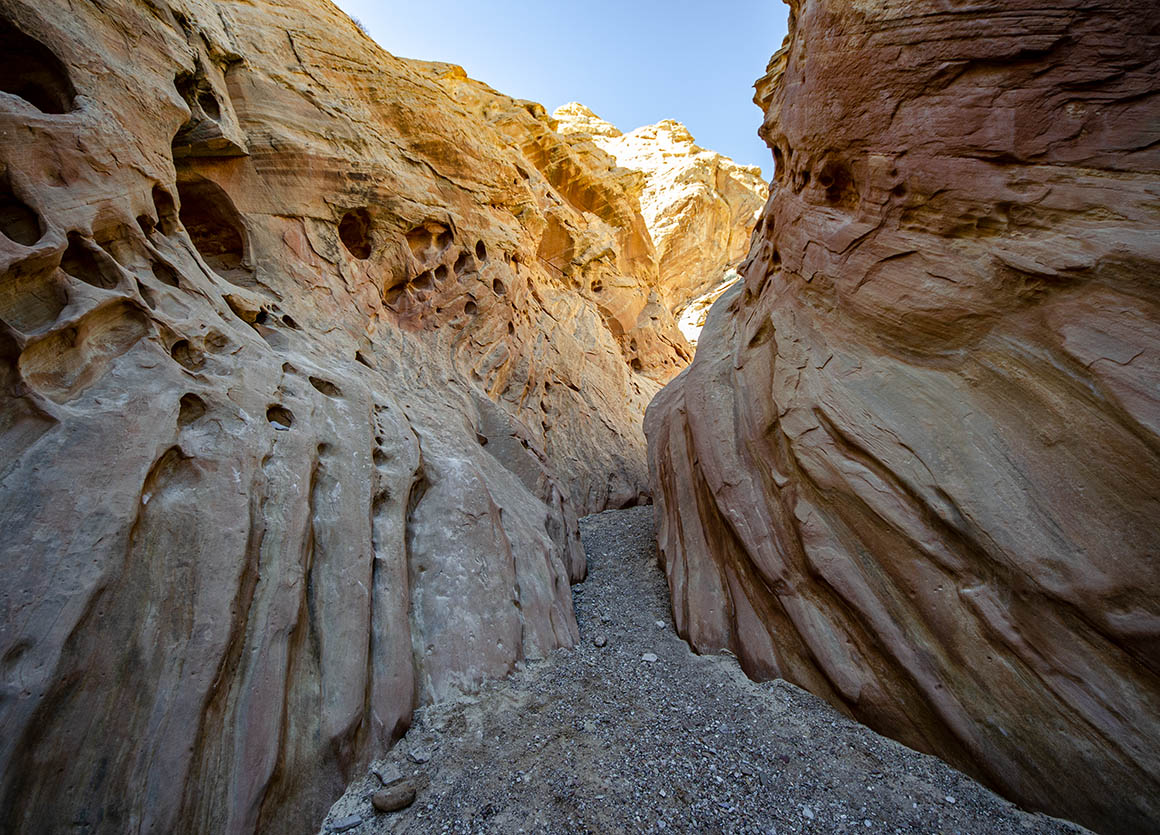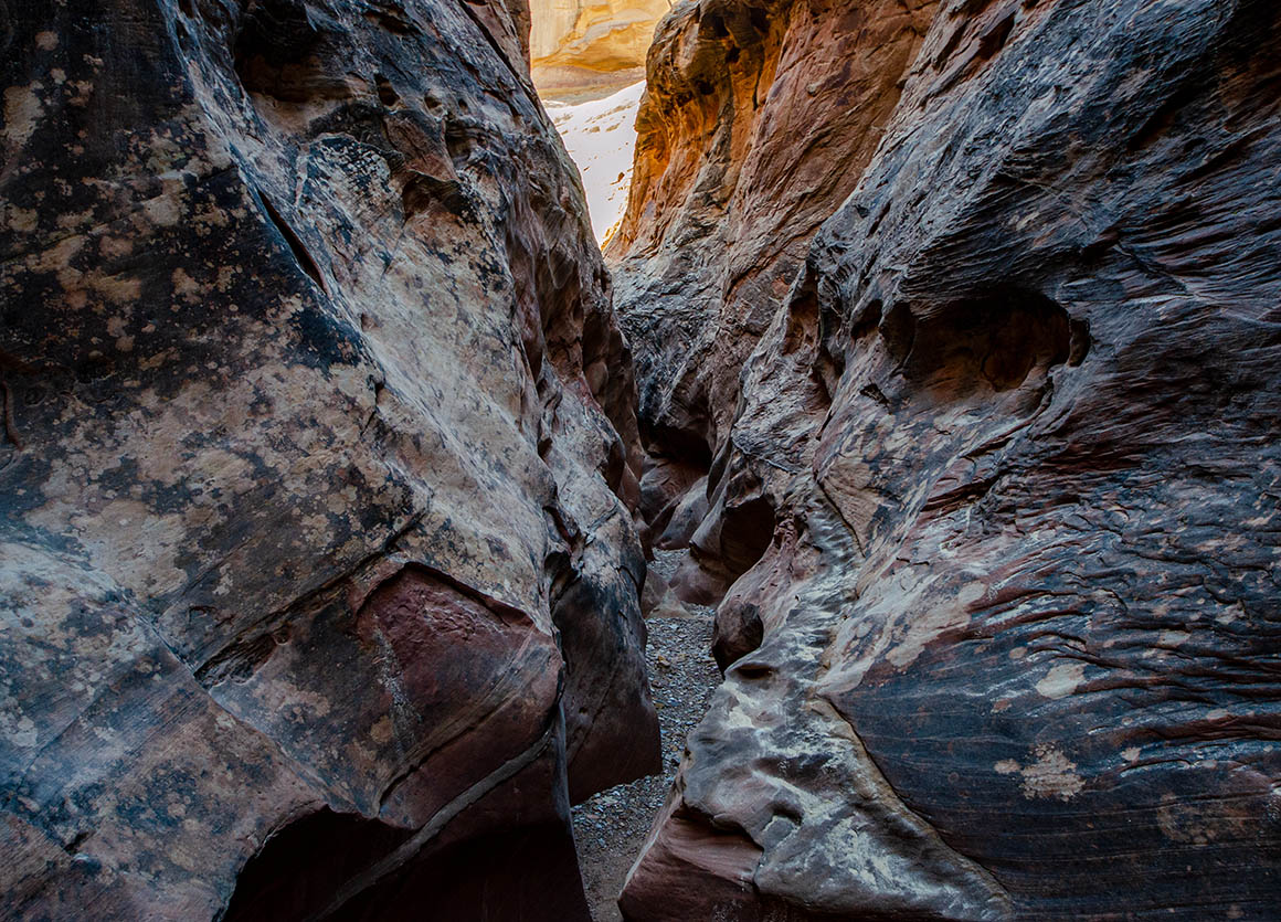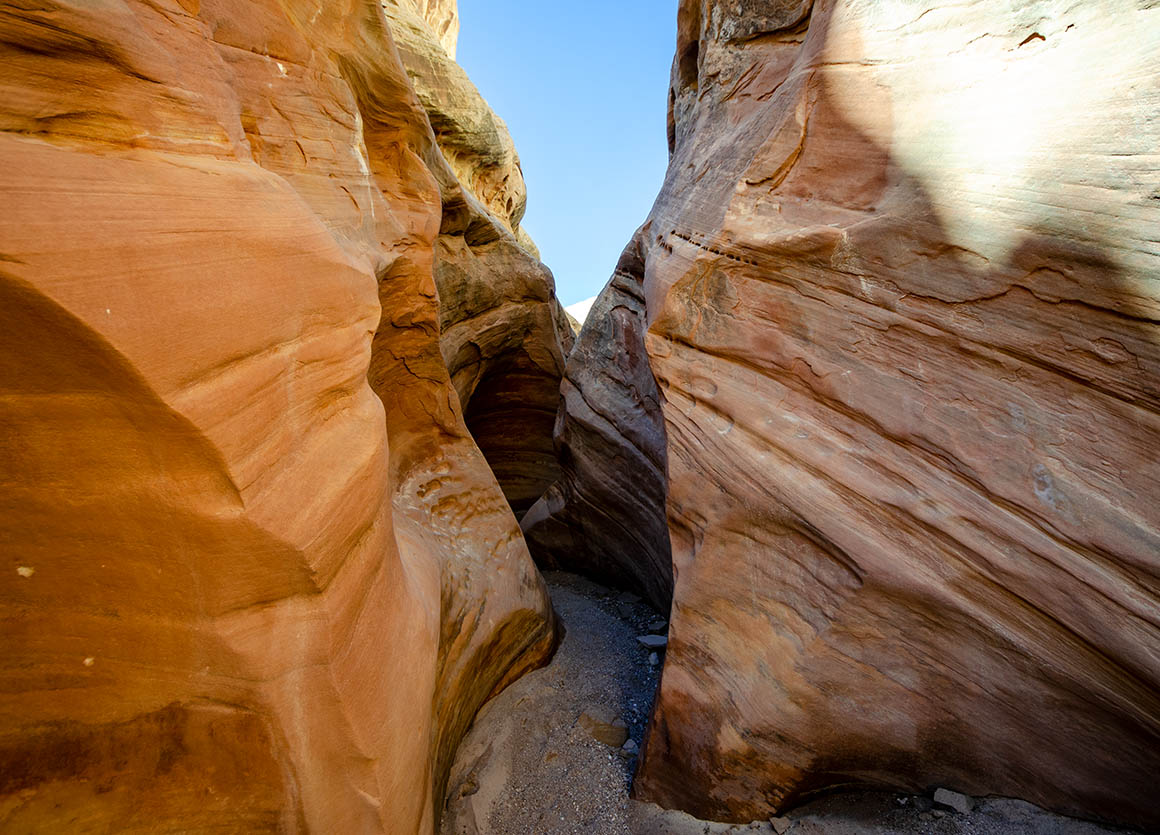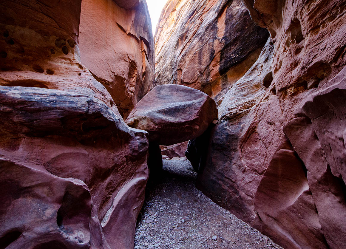 Kurz nach der „gelöcherten Wand“ verengt sich der Canyon. Die komplette Wanderung ist ein 9,4 Meilen langer Roundtrip und führt neben dem Little Wild Horse Canyon auch noch durch den Bell Canyon. Wer sich für diese Tageswanderung entschließt, benötigt ungefähr 5-6 Stunden. So viel Zeit haben wir nicht. Wir haben uns ein Limit von insgesamt 4 Stunden gesetzt – also laufen wir 2 Stunden lang in den Canyon hinein und gingen dann den Weg wieder zurück.  Den kompletten Roundtrip haben wir uns für den nächsten Besuch hier vorgenommen.