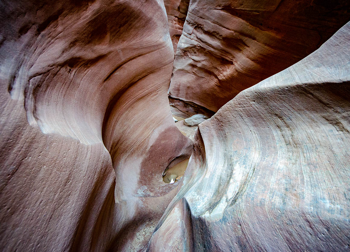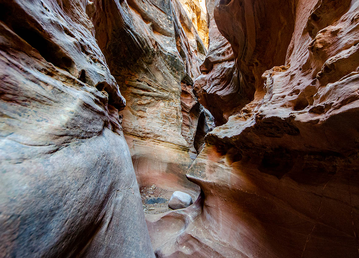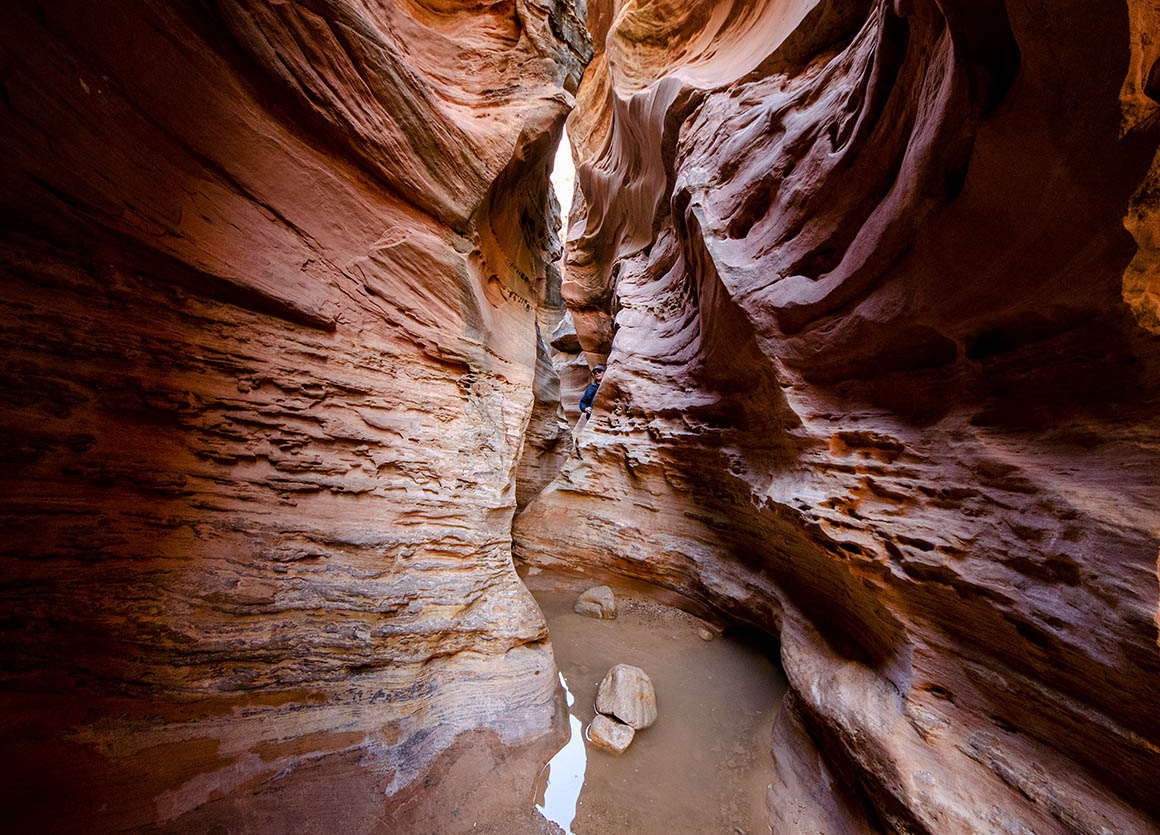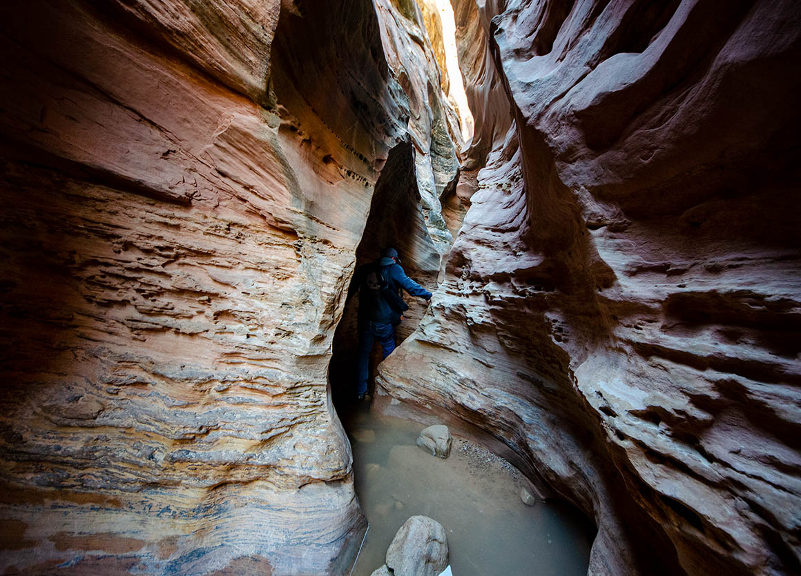 Der Little Wild Horse Canyon ist vielseitg. Es gibt weite, offene Teilstücke, sowie gerade mal schulterbreite Felsspalten. Die eine oder andere Klettereinlage muss sein, genau so wie ein überqueren von kleinen und großen Wasserpfützen. Aber genau das ist es was viel Spaß macht.