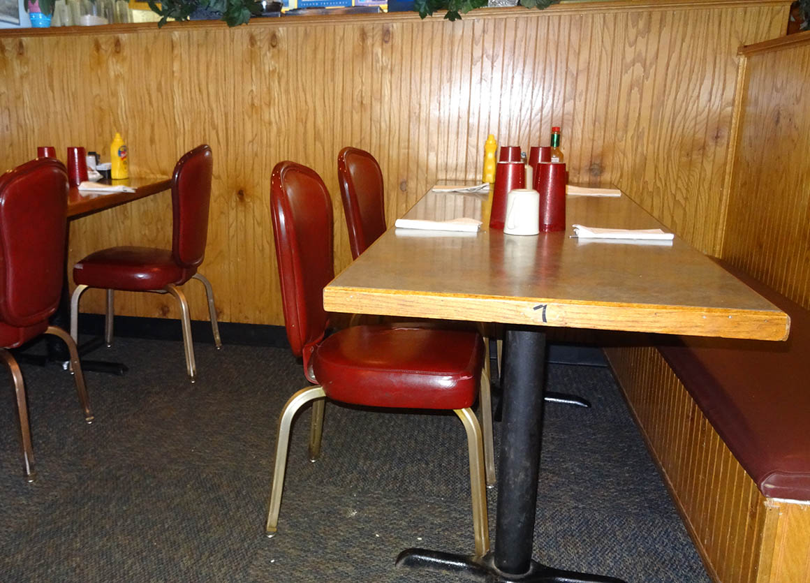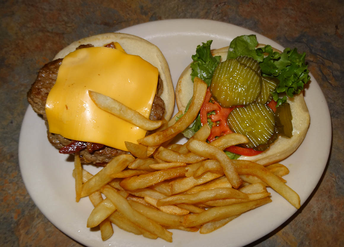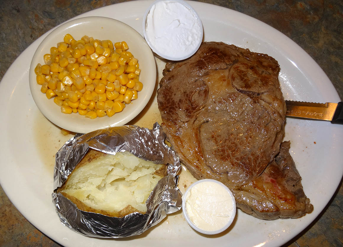 Gegen 17:45 Uhr waren wir wieder in Fairbanks angekommen. Gestern waren wir an einem Restaurant vorbeigefahren, das von außen nett aussah. Also beschlossen wir, dort im Airport Way Family Diner zu Abend zu essen. Ich bestellte ein Steak, während Stefan sich für einen Burger entschied.