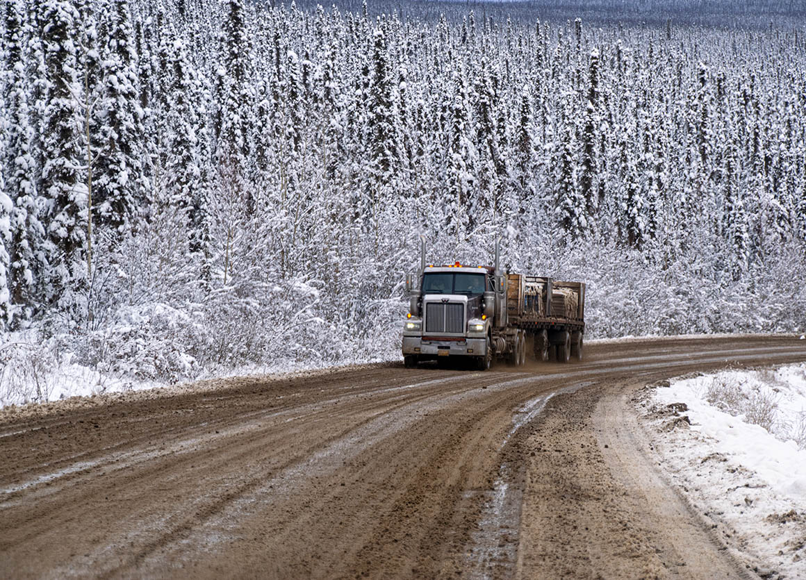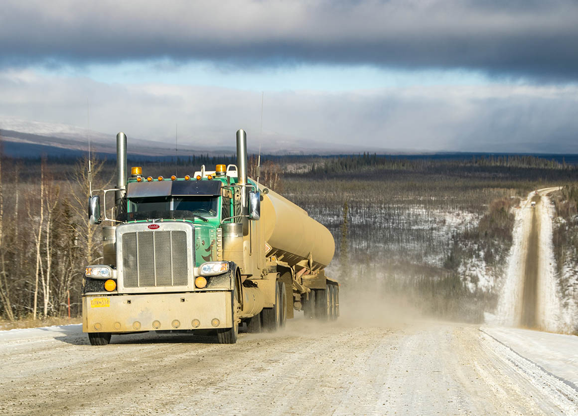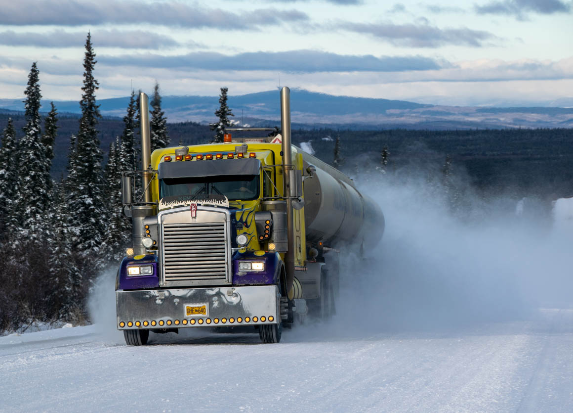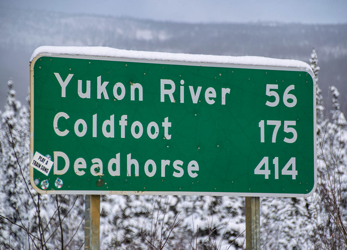 Immer wieder wurden wir auf unserer Fahrt am Hinweisschild am Beginn des Dalton Highways erinnert, auf dem „Heavy Industrial Traffic“ stand. Besonders dann, wenn eine lange Schneefahne einen dieser gigantischen Lastwagen aus der Ferne ankündigte.