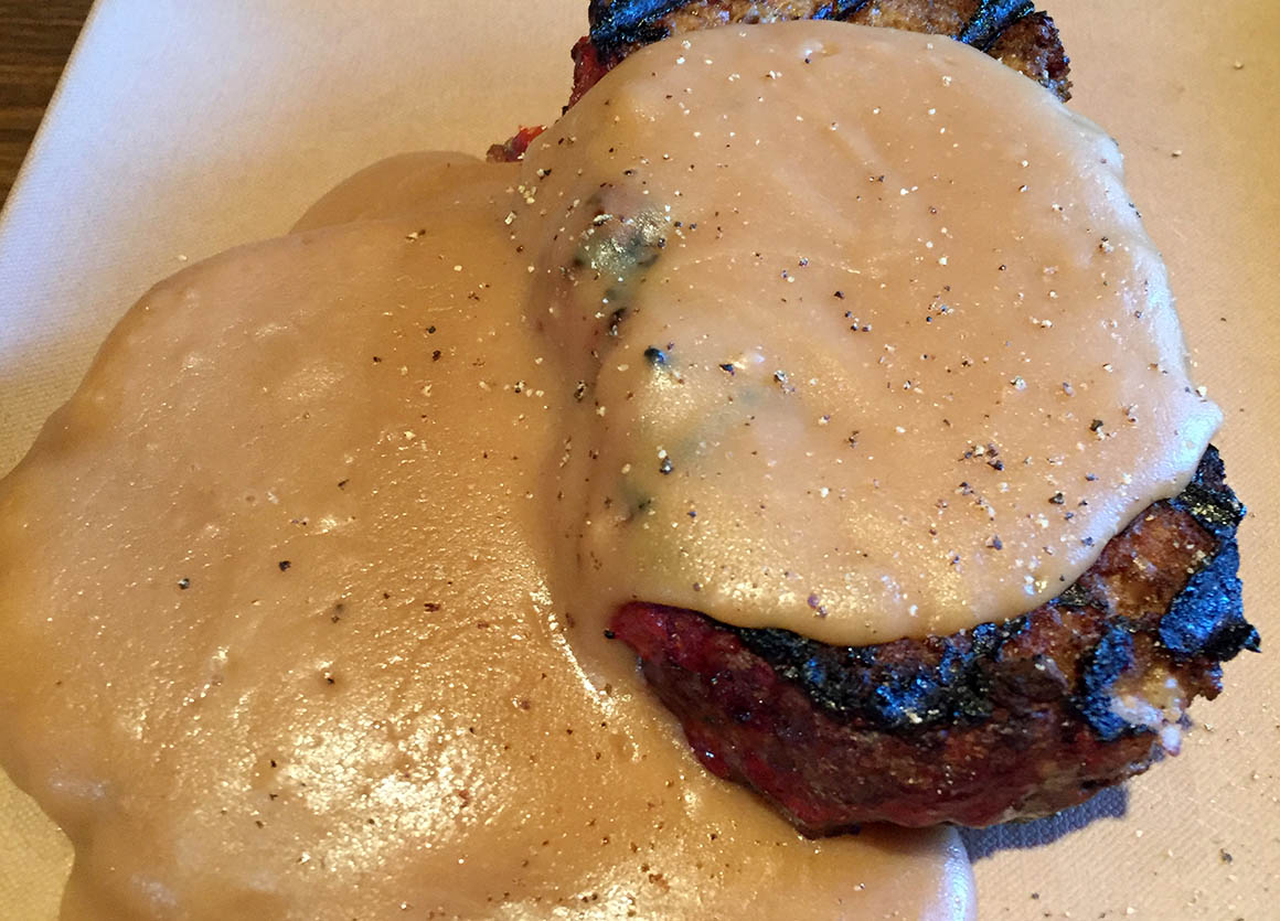 Dann wird’s ernst mit der Bierauswahl. Das ist hier wirklich ’ne ernste Angelegenheit. „Mutti“ wählt natürlich das „Mother Ale“ (was sonst, nicht wahr?), und Stefan, der kein „Vater Ale“ findet, entscheidet sich für ein Bier namens „Chinook“. Mein Rentier-Meatloaf erweist sich als wahrer Gaumenschmaus, vor allem die Soße – sieht zwar nicht besonders fancy aus, schmeckt aber himmlisch.