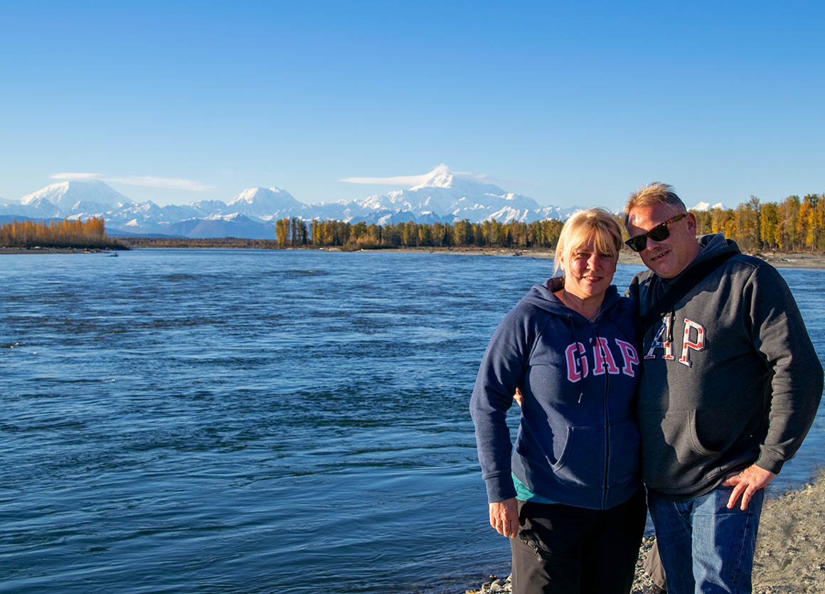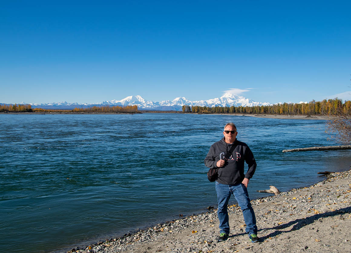 Schließlich entscheiden wir uns dazu, wieder ans Ufer des Flusses zu schlendern, um den atemberaubenden Denali bei Sonnenuntergang zu bewundern. Als wir ankommen, stoßen wir auf unsere texanischen Freunde, die wir in Seward kennen lernten. Mr. Texas erkundigt sich neugierig nach unserem Harding Ice Field Hike. Wir teilen voller Begeisterung die Details unseres aufregenden Abenteuers und tauschen uns noch eine ganze Weile aus. Solche spontanen Begegnungen machen unsere Reise einfach einzigartig.