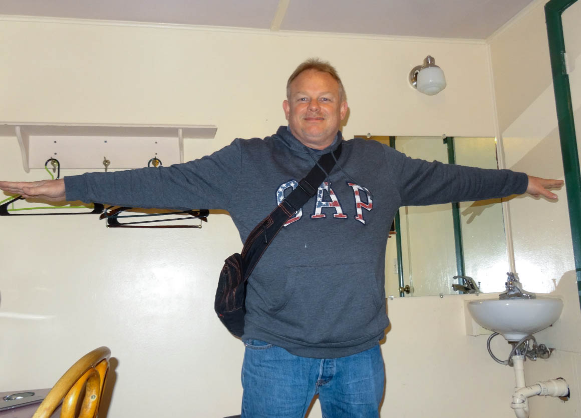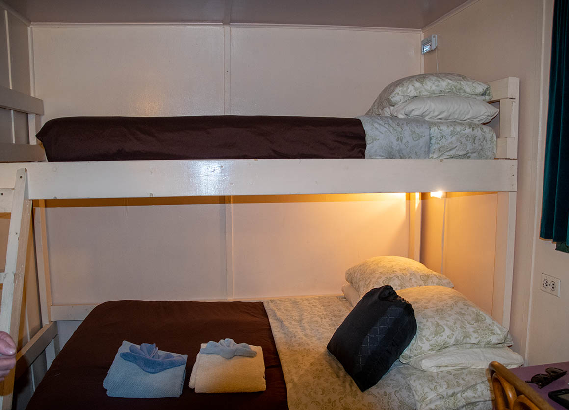 Oh, das ist ja mal ’ne Überraschung! 🎉 Nach unserer Rückkehr ins Roadhouse staunen wir nicht schlecht über die Größe unseres Zimmers. Es ist wirklich winzig, und als ich die Tür aufmache, schau ich direkt auf ein Etagenbett. In unserem Reiseleben haben wir schon so einige Zimmer gesehen, aber ein so kleines hatten wir wirklich noch nie. Ich werfe Stefan einen fragenden Blick zu. „Echt jetzt? Hab ich das gebucht?“ frag ich, während ich versuche, meine Überraschung zu verbergen. „Na ja, war wohl ein besonderes Schnäppchen,“ schieb ich dann nach und versuche, die Situation mit einer Prise Humor zu nehmen. „Für eine Nacht ist das schon okay. Aber eines steht fest: Ich schlaf‘ oben!“ Wir müssen beide lachen, denn wir sind ja schließlich Abenteurer, und so ein ungewöhnliches Zimmer ist doch auch mal ’ne lustige Erfahrung.