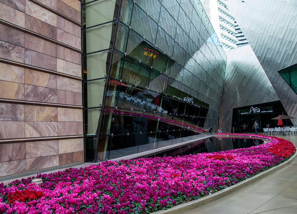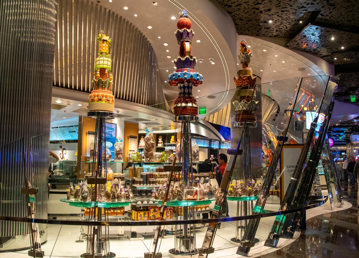 Unser erster Halt ist das Aria Hotel & Casino, ein Ort, der sehr modern und schick ist. Auf dem Weg dorthin begegnen wir einer Bäckerei mit den verführerischsten Mini-Törtchen, die wir je gesehen haben. Mein Magen winkt zwar ab – „rien ne va plus“ – aber das hindert uns nicht daran, die verlockenden Leckereien ausgiebig zu bewundern. Schließlich heißt es ja nicht umsonst, dass das Auge mitisst – und unsere Augen machen hier definitiv einen kulinarischen Rundgang.