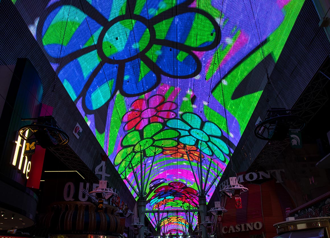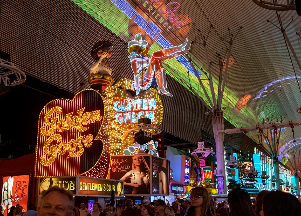 Die Fremont Street Experience erwartet uns mit ihrer beeindruckenden 450 Meter langen und 27 Meter hohen gewölbten Kuppel, an deren Unterseite sage und schreibe 12,5 Millionen LEDs angebracht sind. Nachts erwachen hier atemberaubende Videoshows zum Leben. Entlang der vier Häuserblocks, die die Fremont Street Experience überspannt, reihen sich die ältesten Casinos der Stadt mit ihren lebendigen Neon- und bunten Lichterspielen. In den Seitengassen entdecken wir kleine Bühnen, auf denen wirklich talentierte Bands und Sänger die Besucher zwischen den Lichtshows der Experience bestens unterhalten.